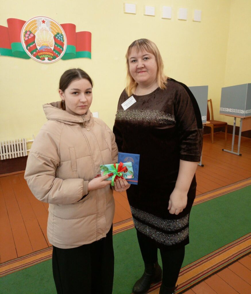 Впервые приняла участие в выборах Анна Сажина. Девушка учится в Гомельском государственном университете имени Франциска Скорины на факультете «лесное хозяйство». Сегодня она отдала свой голос на участке для голосования №15 в родном агрогородке Красная Слобода. Подарок для всех впервые голосующих — книга «Символы суверенной Беларуси».