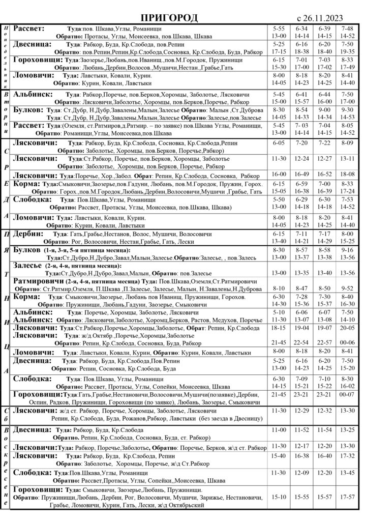 | Октябрьский– Мозырь ч/з Ломовичи, Казанск | Пятница | 14-40 | 17-15 | 18-45 | 21-14 |