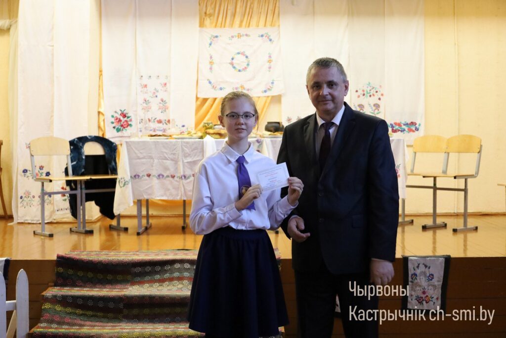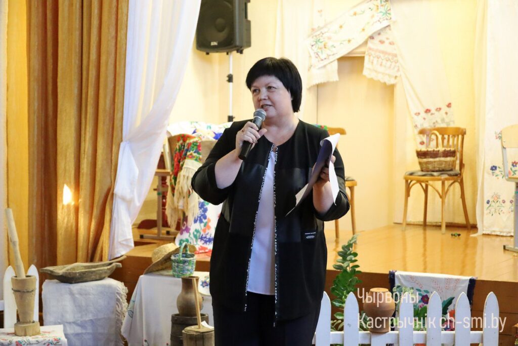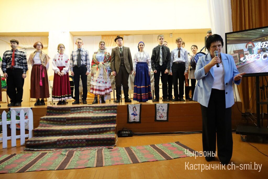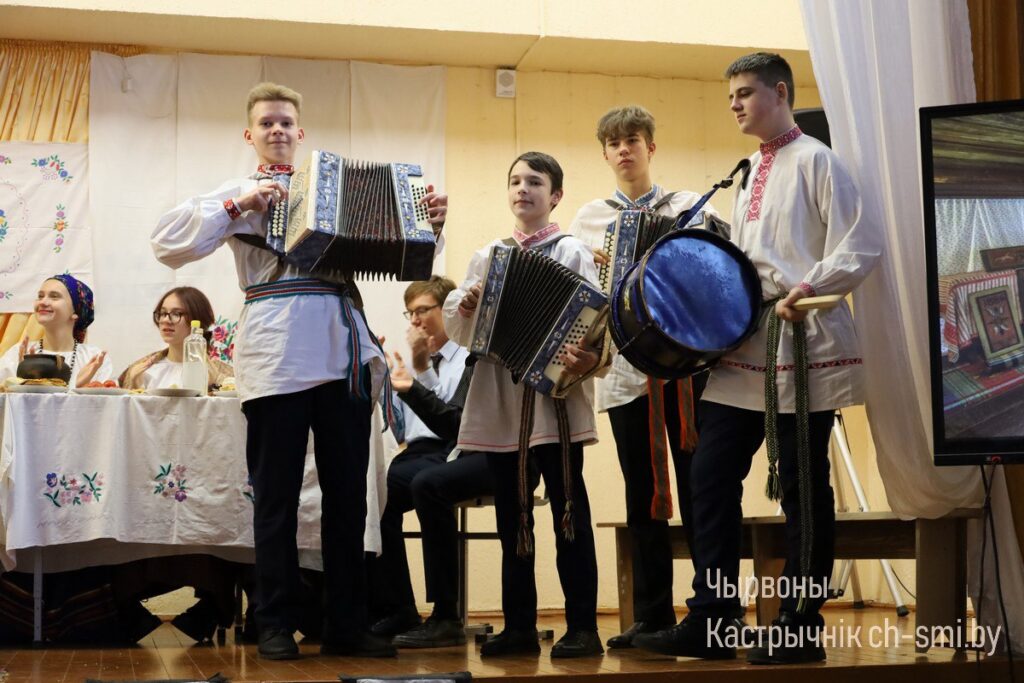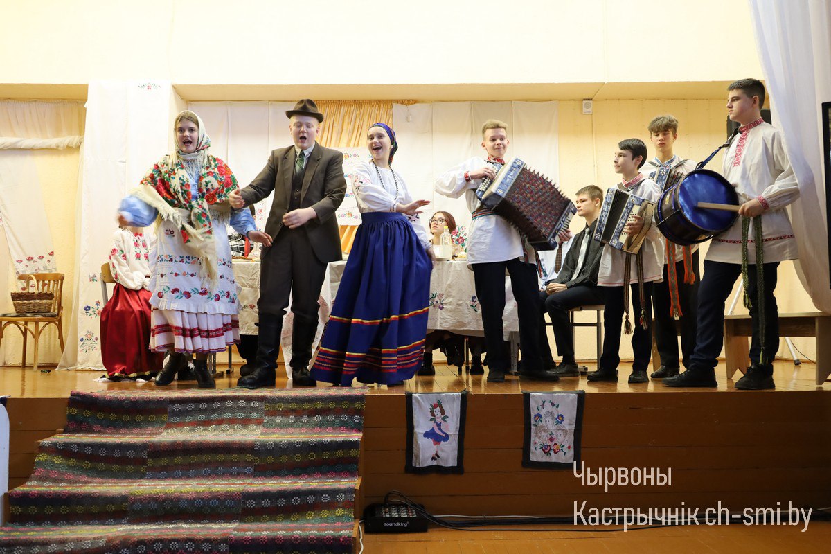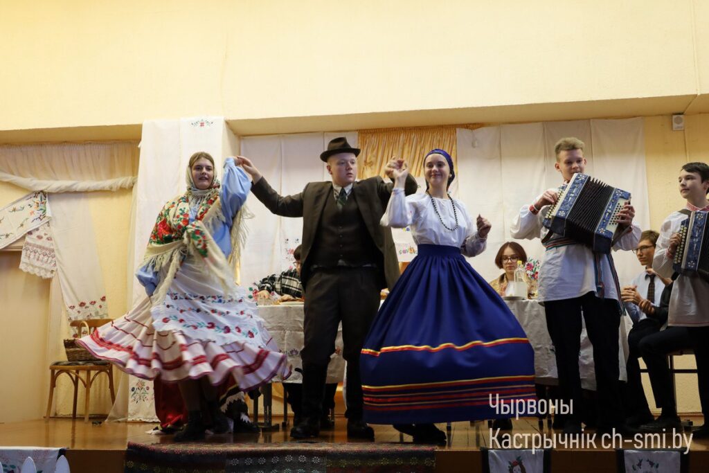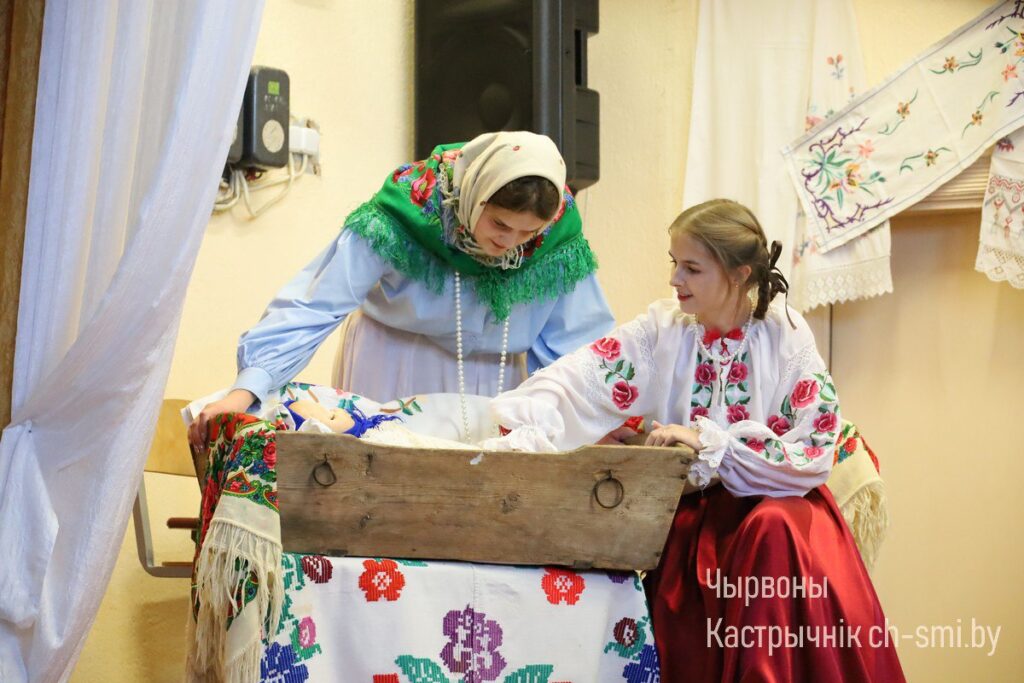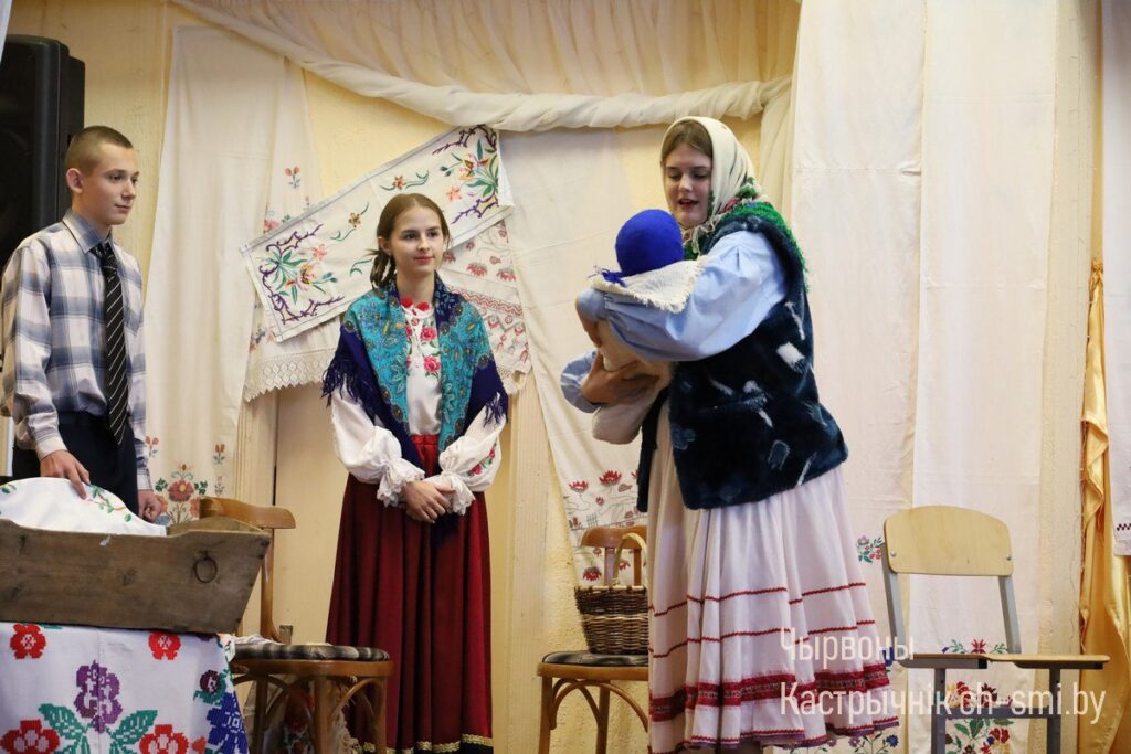 .Вучні старэйшых класаў прадэманстравалі, як раней у вёсках Акцябрскага раёна праходзілі хрэсьбіны навароджанага дзіця. Тэатралізаваная пастанова вельмі спадабалася гледачам.