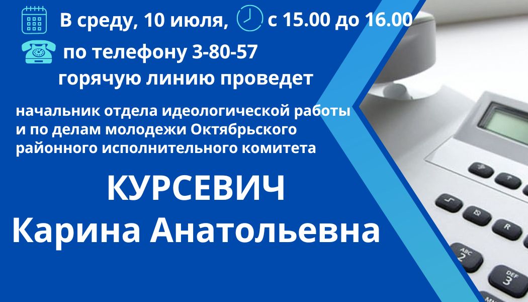 10 июля горячую линию проведет начальник отдела идеологической работы и по делам молодежи Октябрьского райисполкома Карина Курсевич Прямая линия 09 Июл 2024 1180