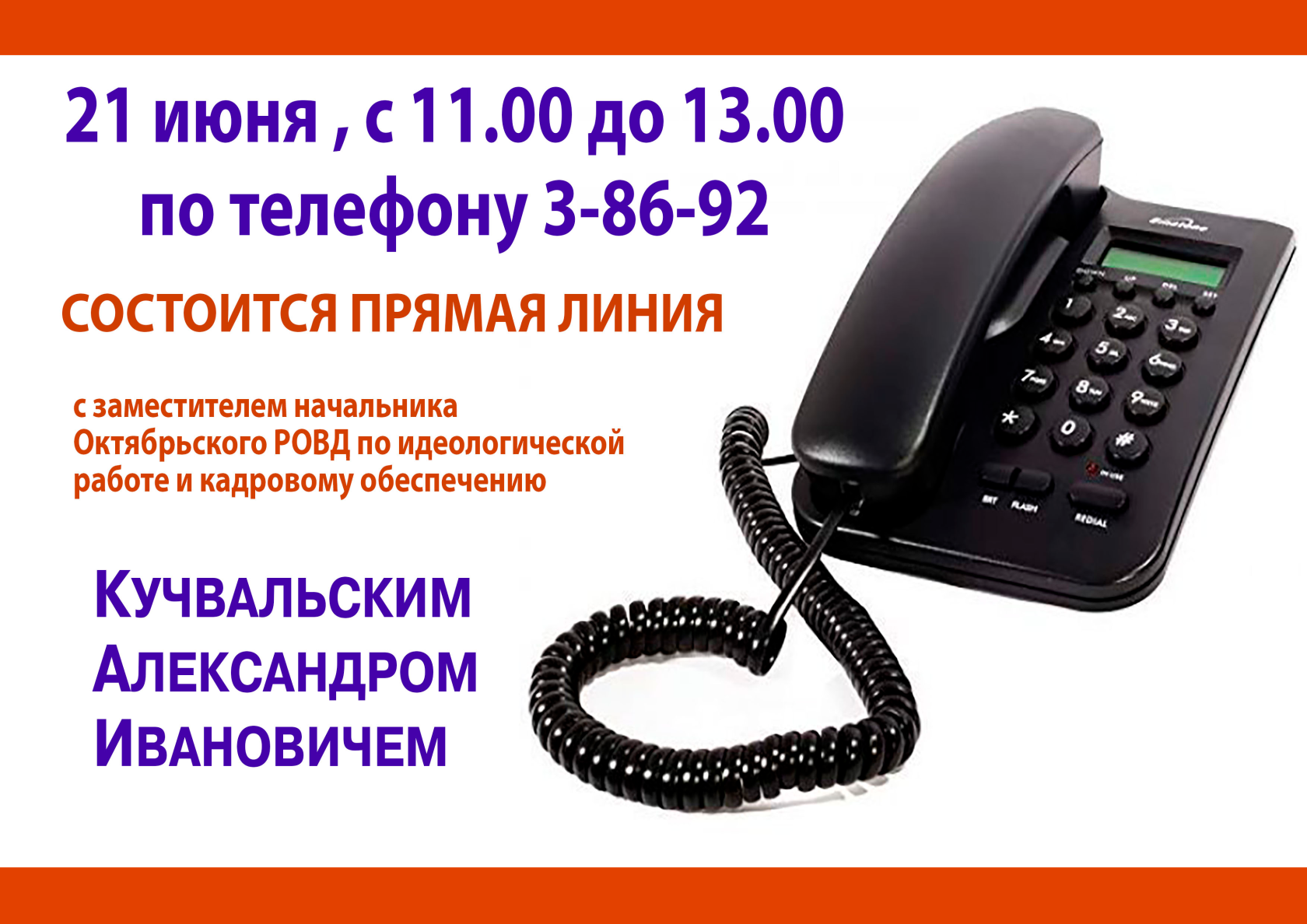 21 июня состоится прямая линия с заместителем начальника Октябрьского РОВД по идеологической работе и кадровому обеспечению Александром Кучвальским Общество Прямая линия 20 Июн 2022 3740