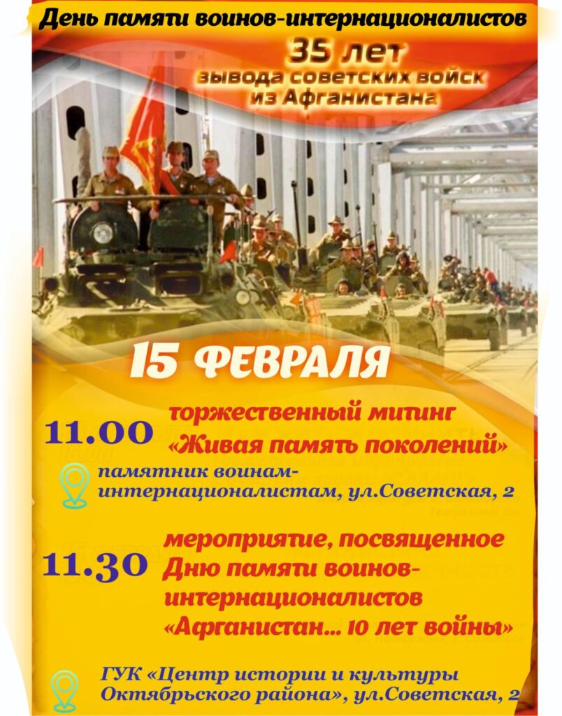 15 февраля в Центре истории и культуры г. п. Октябрьский состоится мероприятие, посвященное Дню памяти воинов-интернационалистов Общество 14 Фев 2024 1500