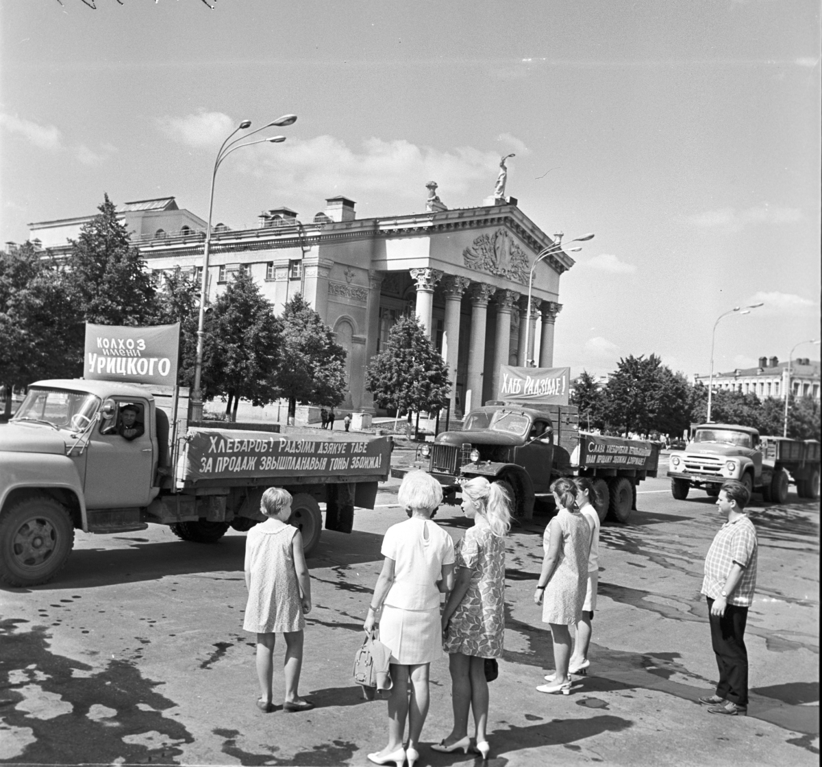 роезд по площади имени Ленина в Гомеле машин с хлебом колхоза имени Урицкого Гомельского района для продажи государству. 4 августа 1970 года