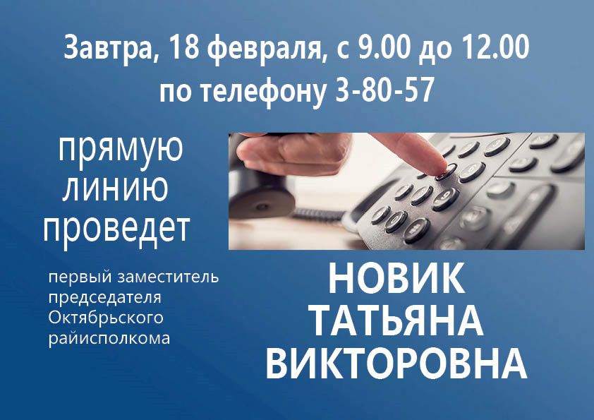 18 февраля прямую линию проведет первый заместитель председателя Октябрьского райисполкома Татьяна Новик Прямая линия 17 Фев 2023 2100