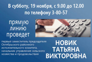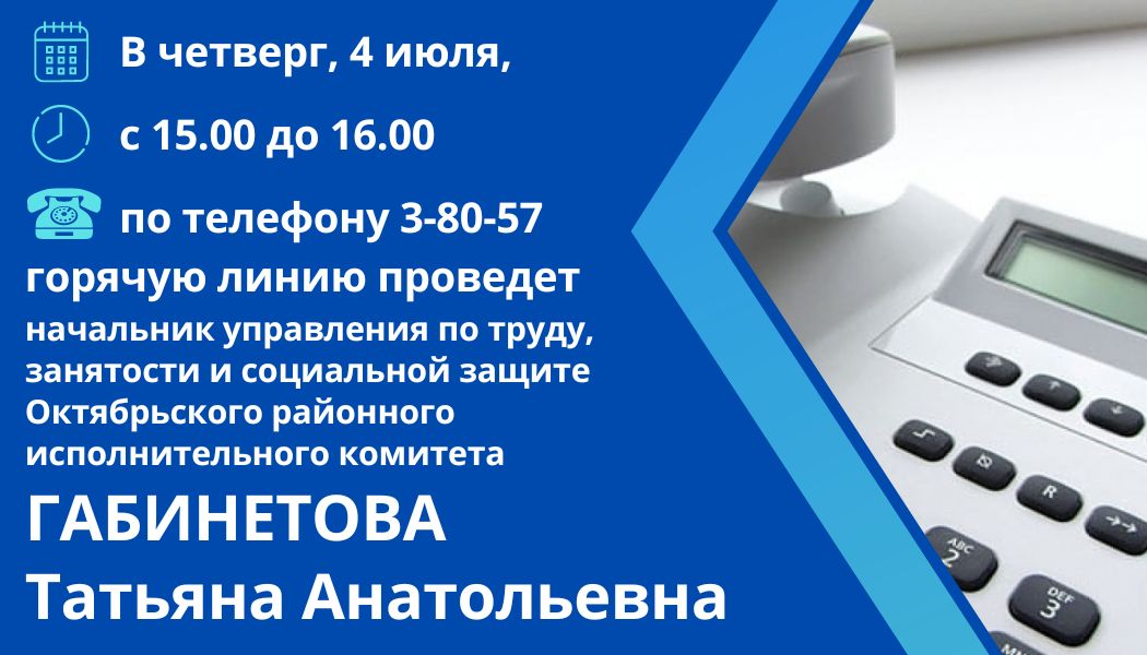 4 июля горячую линию проведет начальник управления по руду, занятости и социальной защите Октябрьского райисполкома Татьяна Габинетова Прямая линия 01 Июл 2024 1200