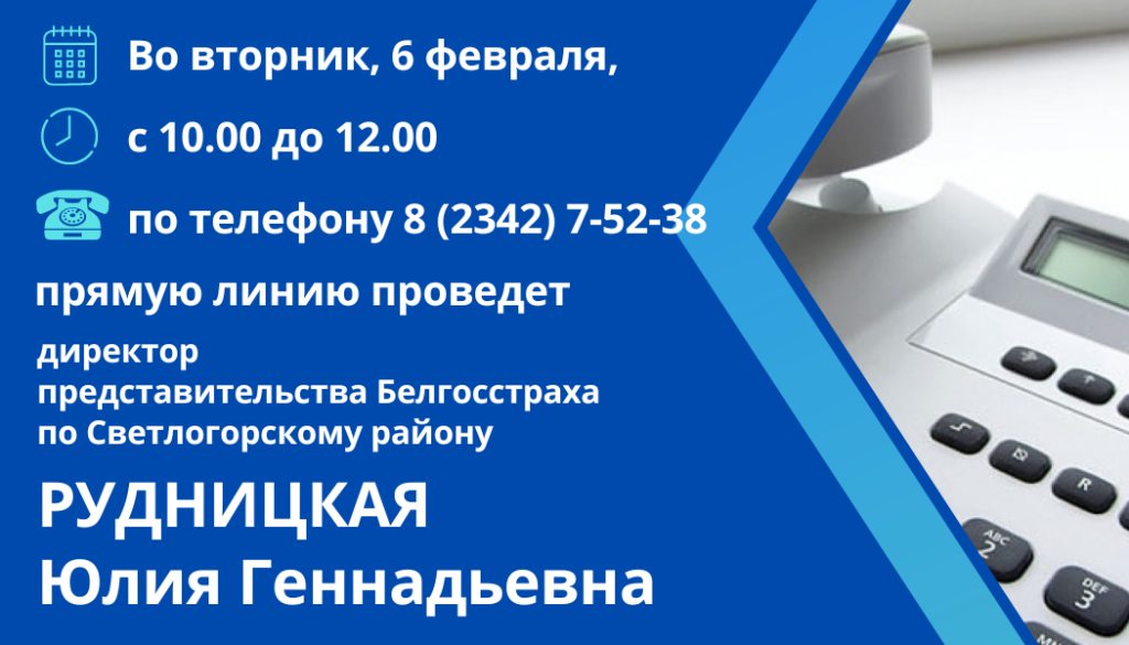 6 февраля прямую линию проведет директор представительства Белгосстраха по Светлогорскому району Юлия РУДНИЦКАЯ Прямая линия 05 Фев 2024 3350