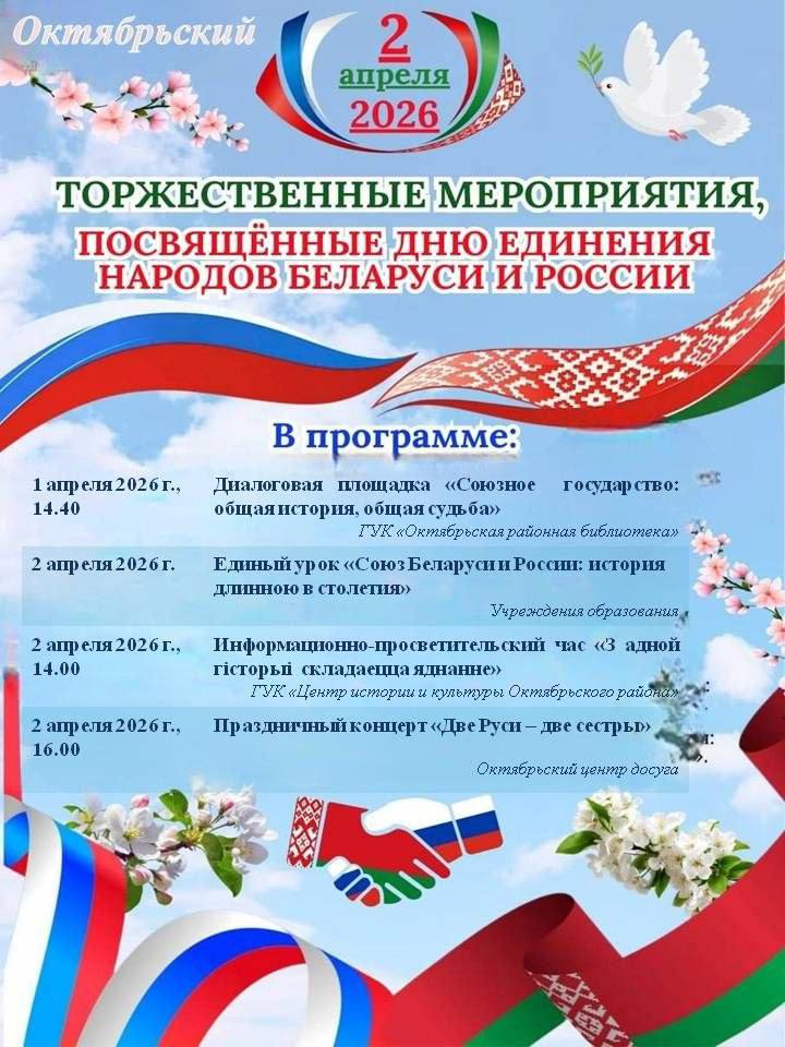 Афиша торжественных мероприятий в Октябрьском, посвященные Дню единения народов Беларуси и России Общество 31 Мар 2026 18080