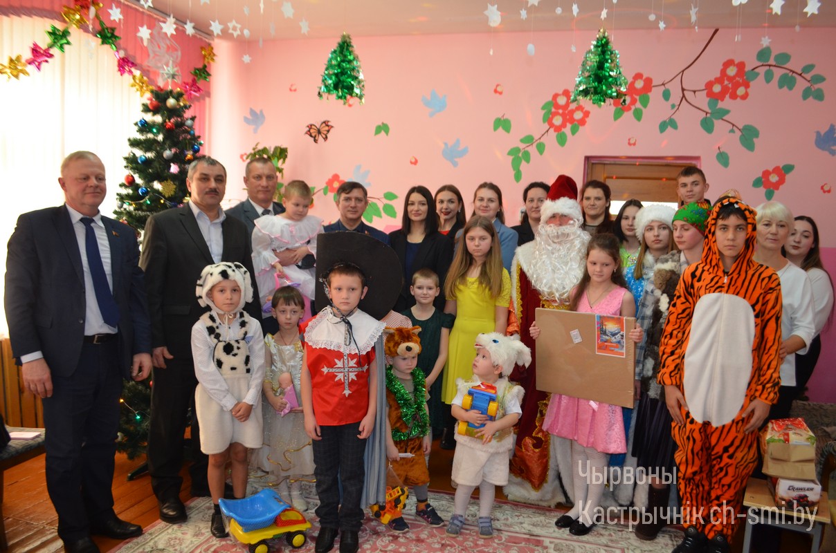 К ребятам и их педагогам приехали в гости с почетной миссией депутат Палаты представителей Национального собрания Республики Беларусь Николай Маратаев, председатель Октябрьского районного Совета депутатов Александр Луцкович, председатель Ломовичского сельисполкома Михаил Камзолов, исполнительный директор ОАО «Ломовичи» Сергей Бобренок, первый секретарь районного комитета ОО «БРСМ» Ирина Циуля вместе с волонтерами из отряда «Доброе сердце», руководитель районной организации Белорусского общества Красного Креста Екатерина Лукьяненко, представители Молодежного совета при райсовете депутатов и специалисты отдела образования райисполкома. Всем присутствующим была представлена праздничная поздравительная программа, включающая в себя новогоднее представление с участием Деда Мороза, Снегурочки и особенно понравившейся гостям и детворе Бабы Яги и Тигра, с хороводами и играми около новогодней елки, что заслуживало искренних аплодисментов и самой высокой оценки. В праздничное торжество органично включилось и вручение подарков ребятам (сертификат на приобретение стиральной машины, игрушки-сувениры, наборы конфет, канцелярские принадлежности и другое) которые по уже давней традиции привезли почетные гости. И, безусловно, с их стороны прозвучали самые искренние поздравления в адрес воспитанников социально-педагогического центра, чтобы мальчики и девочки загадали как можно больше для себя светлых желаний, и они обязательно исполнились.