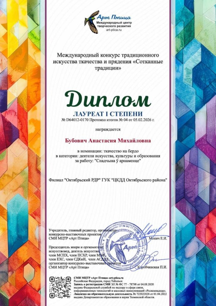 Мастер Октябрьского районного Дома ремесел Анастасия Бубович стала лауреатом первой степени в Международном конкурсе традиционного искусства ткачества и прядения «Сотканные традиции» (г. Тобольск)