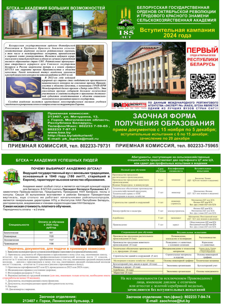 Белорусская государственная орденов Октябрьской Революции и Трудового Красного Знамени сельскохозяйственная академия приглашает на обучение Реклама, объявления 10 Сен 2024 2760