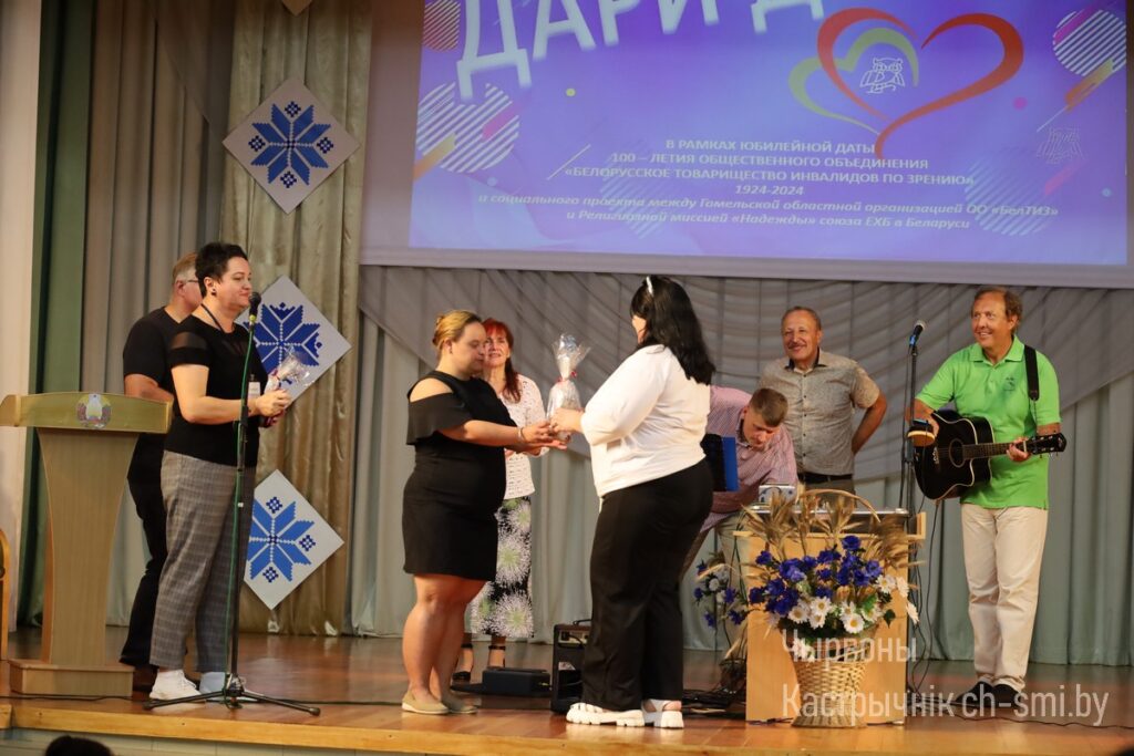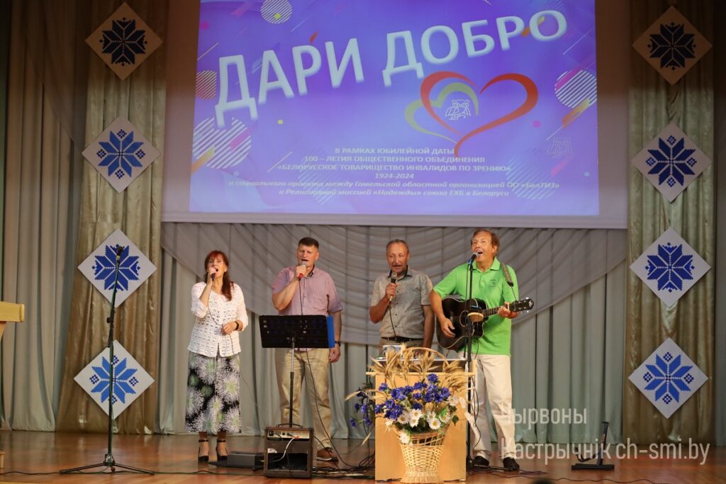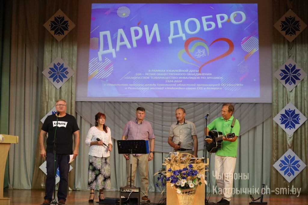 В Октябрьском районном центре досуга для людей с инвалидностью, в том числе с нарушениями зрения, прошла благотворительная акция «Дари добро», инициированная Гомельской областной организацией ОО «Белорусское товарищество инвалидов по зрению» и религиозной миссией «Надежда» союза Евангельских христиан-баптистов Беларуси. В зале речь шла о таких ценностях в жизни каждого человека, как семья, родители, дети, любовь к ближнему. Звучали песни. В конце мероприятия гостям вручили сувениры, сделанные руками людей с инвалидностью, посещающих ТЦСОН. От благотворительный миссии «Надежда» все участники получили в подарок продуктовые наборы.