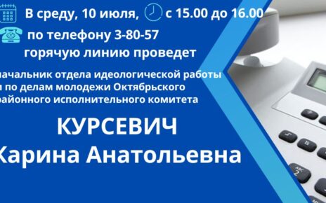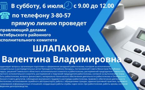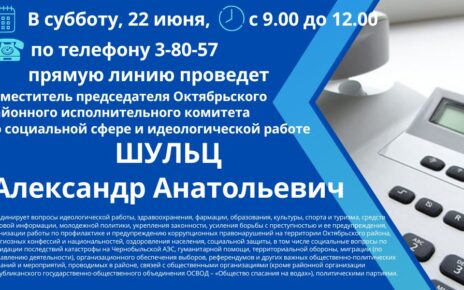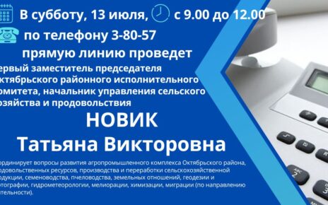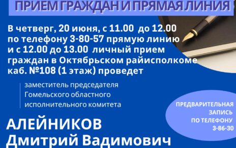 В пятницу, 12 июля, член Постоянной комиссии Совета Республики Национального собрания Республики Беларусь по законодательству и государственному строительству Ксения Александровна ПАНТЮХОВА проведет: с 11.00 до 12.00 личный прием граждан, в том числе индивидуальных предпринимателей и представителей юридических по адресу: г.п. Октябрьский, ул. Советская, 57, зал заседаний (Октябрьский районный исполнительный комитет); с 12.00 до 13.00 прямую […]