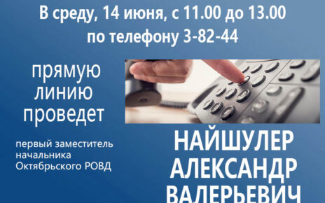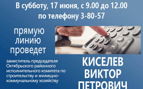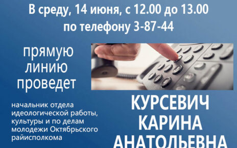 В субботу, 29 июля, с 9.00 до 12.00 по телефону 3-80-57 состоится прямая линия с первым заместителем председателя Октябрьского районного исполнительного комитета, начальником управления сельского хозяйства и продовольствия НОВИК Татьяной Викторовной.