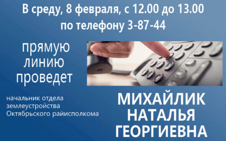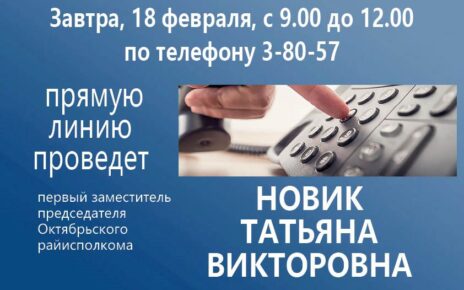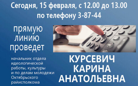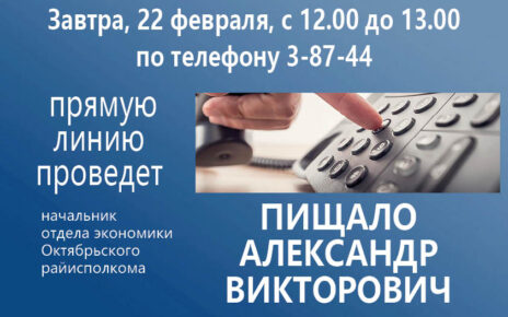 В субботу, 11 марта с 9.00 до 12.00 по телефону 3-80-57 состоится прямая линия с заместителем председателя Октябрьского районного исполнительного комитета по строительству и жилищно-коммунальному хозяйству КИСЕЛЕВЫМ Виктором Петровичем.