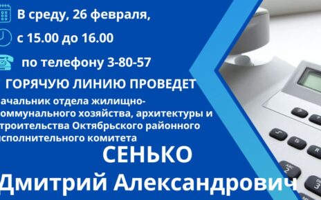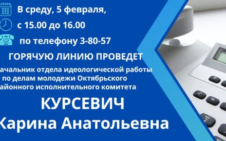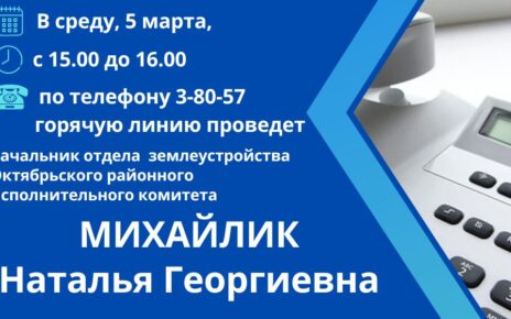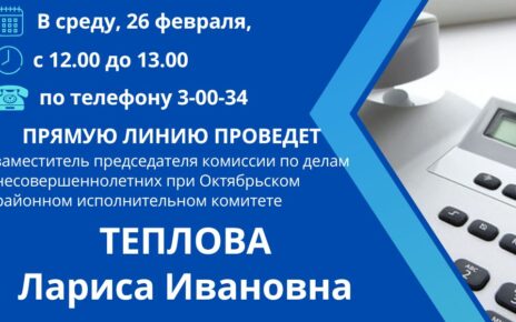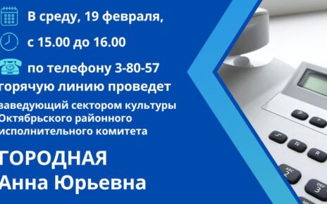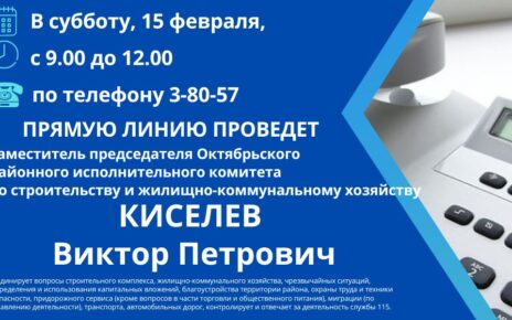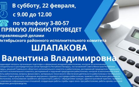 Во вторник, 11 февраля, с 11.00 до 12.00 «прямую телефонную линию» по телефону 3-80-57 и личный прием граждан в Октябрьском районном исполнительном комитете (кабинете № 108, 1 этаж) проведет заместитель председателя комитета по труду, занятости и социальной защите Гомельского областного исполнительного комитета КУЛЕШ ТАТЬЯНА НИКОЛАЕВНА Предварительная запись на личный прием по телефону: 8 (02357) 3-84-25, […]