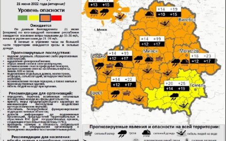21 июня по юго-западной половине республики прогнозируется усиление ветра порывами до 15-20 м/с, ночью и утром местами 21-24 м/с. В ночные и утренние часы на большей части территории страны ожидаются грозы и сильные дожди. Грозы, сильные дожди, усиление ветра до 20 м/с сохранятся в отдельных районах республики 22 июня. Октябрьский РОЧС.