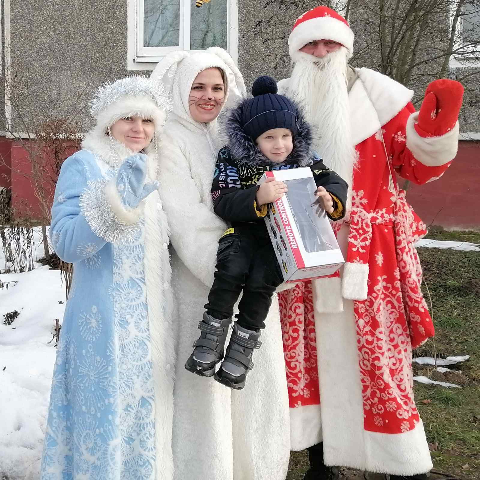 Дед Мороз, Снегурочка, символ года – Кролик, Снеговик – увидев всех этих персонажей в окне, трехлетний Юра закричал от восторга! С музыкой, в повозке, запряженной под стать погоде не оленями, а лошадкой – весь этот состав ожидал нас на улице, чтобы подарить новогоднее настроение. Стихи, песни, танцы, игры –прибывшие гости устроили представление моему сыну и подарили сказку нам, взрослым. Бонусом запланированной программы стал круг почета в нарядном экипаже с музыкой и Снеговиком, управляющим необычным транспортом!