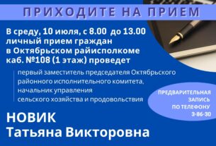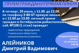 30 июля с 10.00 член Постоянной комиссии Совета Республики по региональной политике и местному самоуправлению, председатель Гомельского областного Совета депутатов Зенкевич Екатерина Анатольевна проведет личный прием граждан, в том числе индивидуальных предпринимателей, их представителей и представителей юридических лиц по адресу: Гомельская обл., Жлобинский район, д. Антоновка, ул. Центральная, д. 2 (Государственное учреждение образования «Антоновская средняя школа Жлобинского района»).