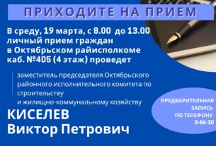 Личный прием будет проходить по предварительной записи в рабочие дни с 9.00 до 13.00 и с 14.00 до 18.00 по телефону: 8 (02334) 4-48-86.