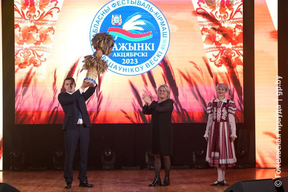 Символический сноп председатель Октябрьского райисполкома Ирина Намоченко передала председателю Кормянского района Дмитрию Шинкаренко.