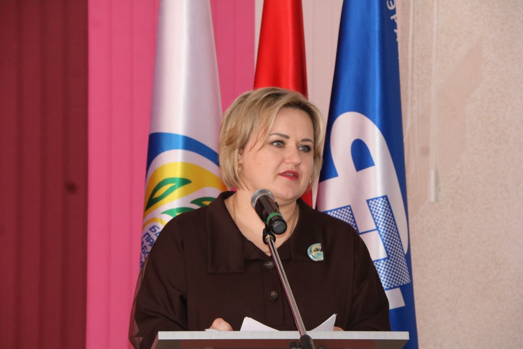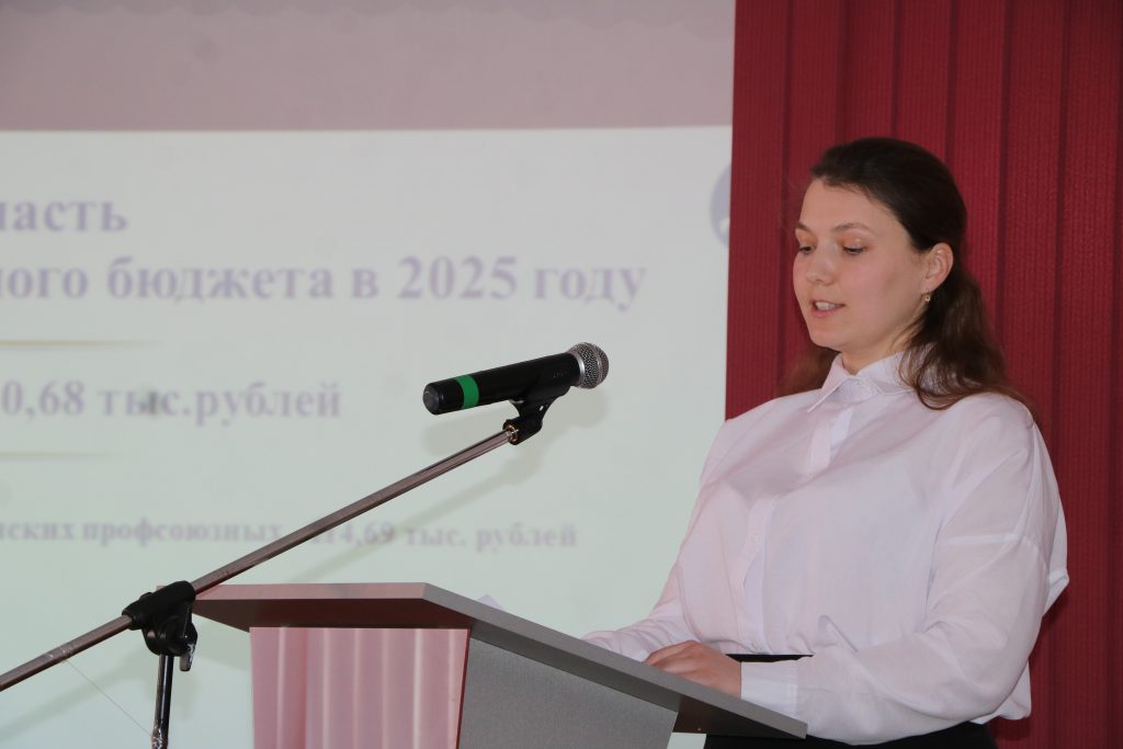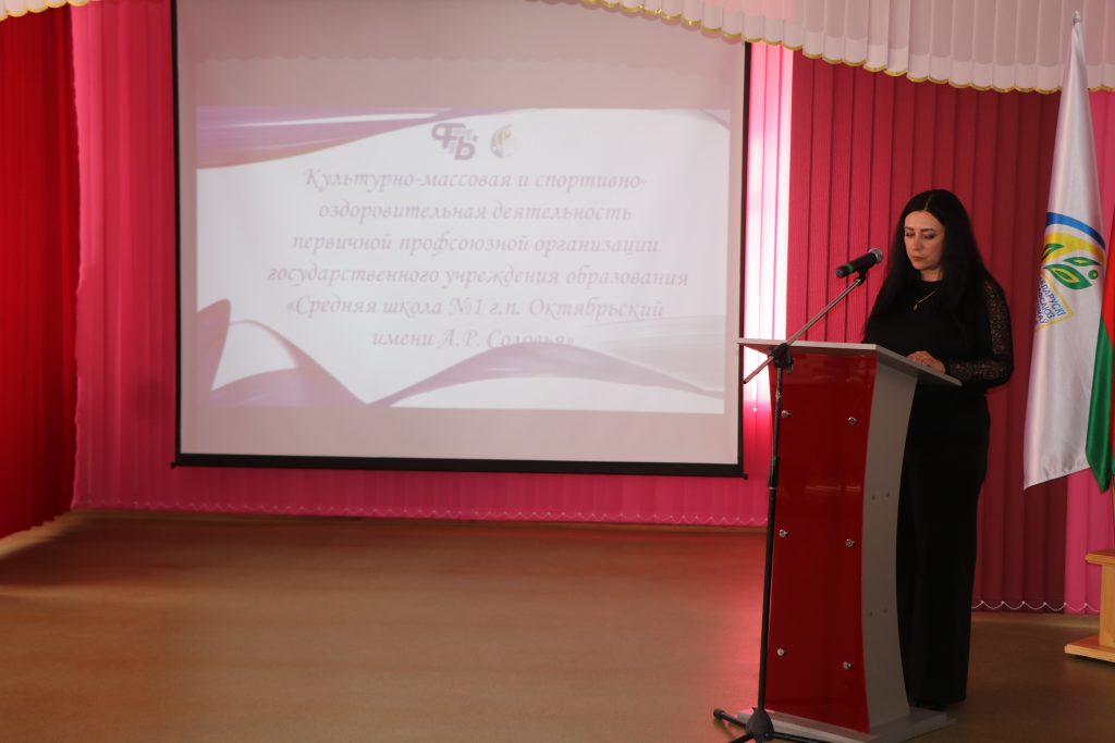 С отчетным докладом выступила председатель первичной профсоюзной организации средней школы №1 г. п. Октябрьский имени А. Р. Соловья Татьяна Клыга.