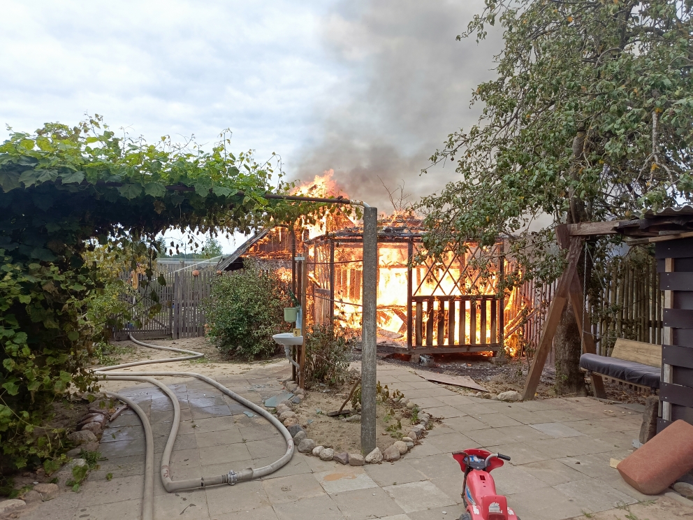 В результате пожара уничтожена беседка, повреждены кровля и имущество в хозяйственной постройке. Рассматриваемая версия причины пожара – неосторожное обращение с огнем при курении.