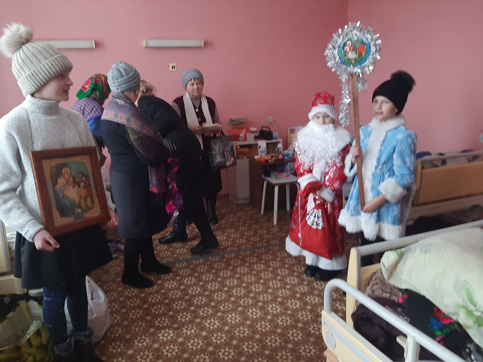В рамках новогодней благотворительной акции «От всей души» постояльцев Заболотской больницы сестринского ухода, которые временно пребывают в центральной районной больнице, накануне Старого Нового года посетили настоятель Краснослободского храма Нерукотворного Образа Господня отец Валерий с матушкой Аллой, их дети и прихожане сельского прихода. Вооружившись подарками и хорошим настроением, они отправились с Дедом Морозом и Снегурочкой к пожилым пациентам.