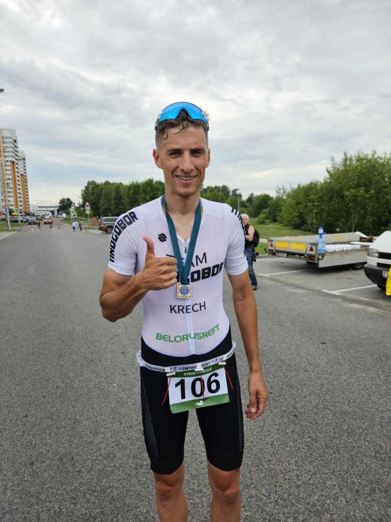 Неоднократный участник и победитель подобных соревнований, в том числе и прошлогоднего Минского полумарафона, Евгений Креч и в этот раз продемонстрировал свою отличную физическую подготовку, проявил твердую волю к победе, показав лучший результат среди всех участников (84 человека) в номинации «Абсолют», а также в возрастной категории 25-34 лет (Евгению Александровичу недавно исполнилось 30). Он преодолел вышеуказанный маршрут триатлона за 1 час 51,5 секунды и был удостоен титула победителя и высшей награды.