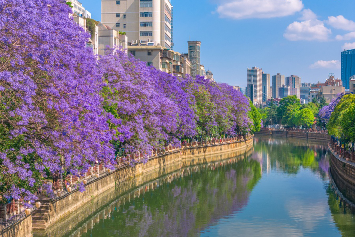 на юго-западе Китая, расцвела жакаранда. Взглянуть на это красивое