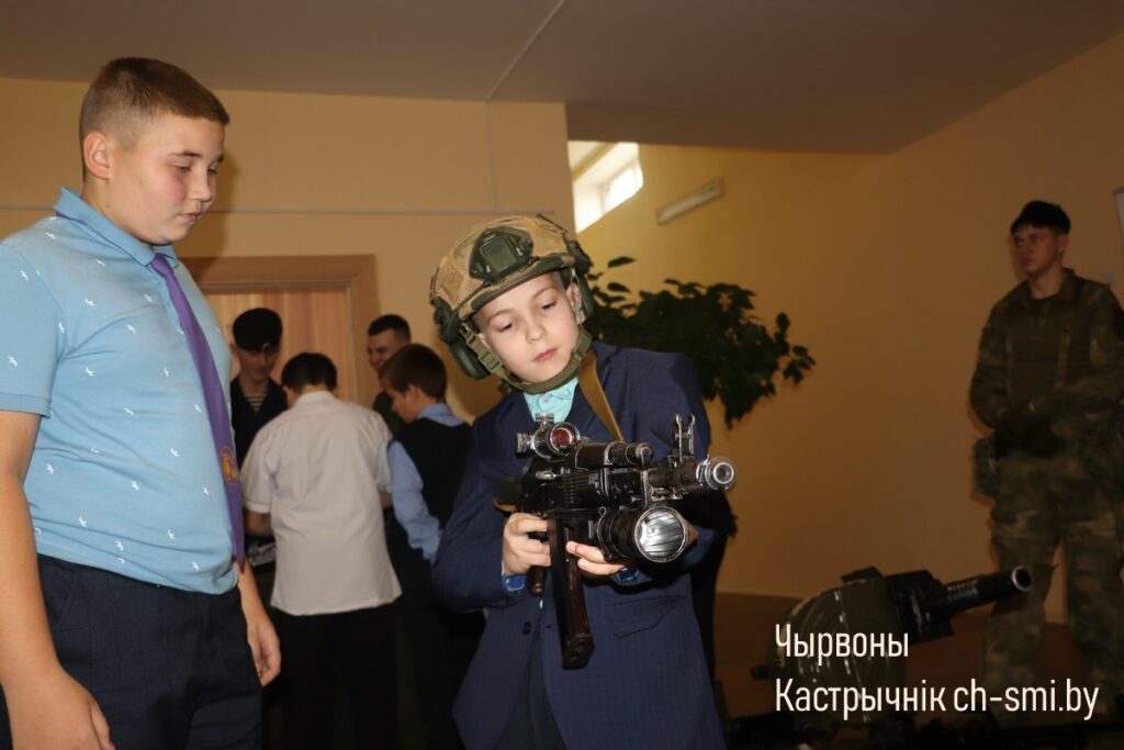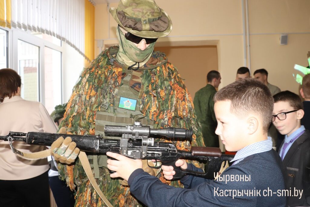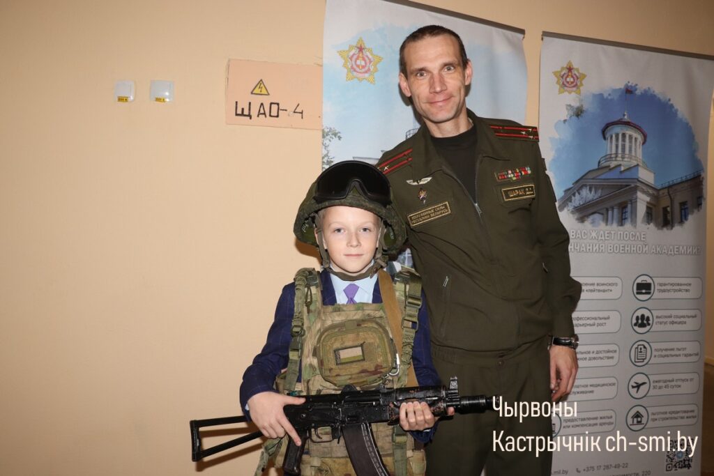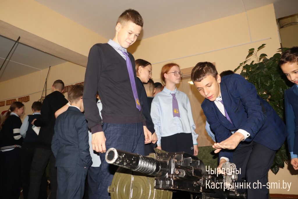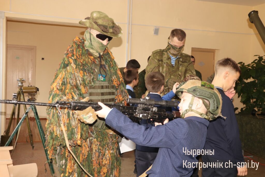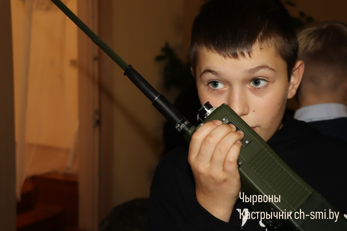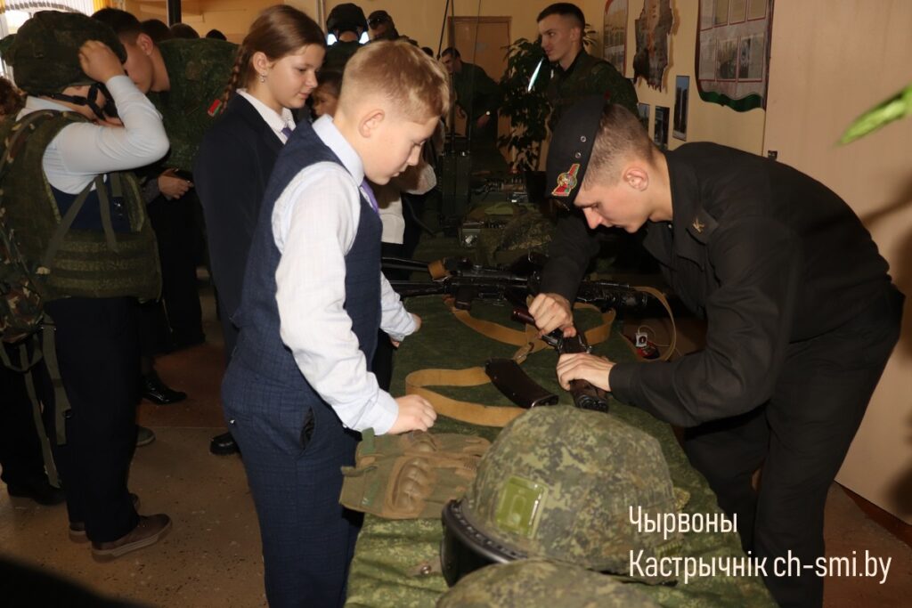 С приветствием к ребятам обратился начальник обособленной группы (Октябрьского района) военного комиссариата Светлогорского и Октябрьского районов Артем Булавко, который, в рамках взаимодействия с военными вузами, выступил организатором встречи. Артем Константинович подчеркнул, что профориентационные встречи организовываются с целью повышения мотивации учащихся. Он обратил внимание, что профориентация – вопрос для многих школьников и их родителей непростой. Думать о своем будущем нужно начинать заранее. У школьников разные представления о своей будущей профессии, поэтому во время таких встреч, приглашенные гости нацелены на то, чтобы подготовить старшеклассников и предоставить им полный объем информации о той или иной специальности. Так, об особенностях профессии офицера рассказал начальник кафедры автоматизированных систем управления войсками факультета связи и АСУ, полковник Дмитрий Шарак. Он приехал в районную гимназию с курсантами, представителями всех факультетов Военной академии, которые организовали для гимназистов не только военно-патриотическое занятие, но и продемонстрировали для всех желающих учеников образцы вооружения и техники, которые изучают будущие военнослужащие. Перед беседой ребята смогли примерить военную форму, ознакомились с устройством и принципом работы оружия, пообщались с курсантами.