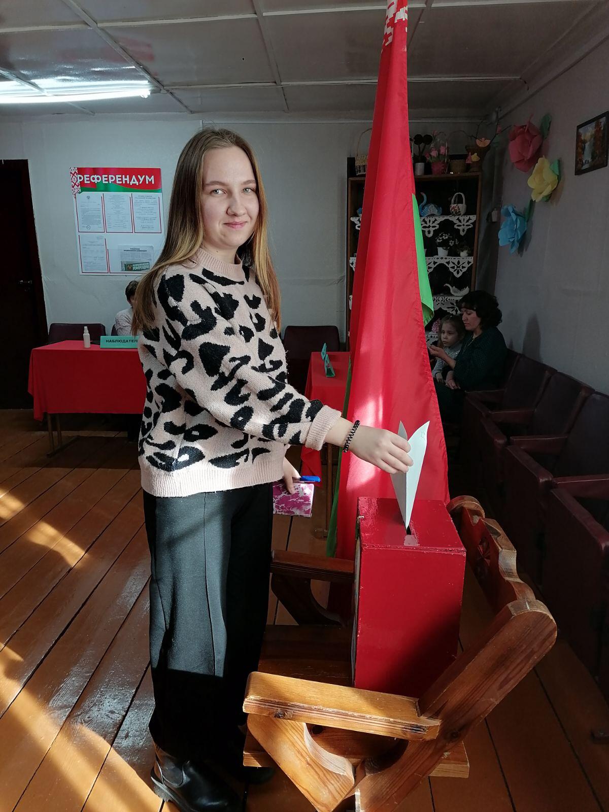 С хорошим настроением на участок для голосования пришла молодой специалист Дана Мытник, которая преподает в детской школе искусств в г. п. Октябрьский. Она впервые принимает участие в таком важном мероприятии. Для нее момент участия в досрочном голосовании на республиканском референдуме стал волнительным, важным и ответственным. «Голосую за свое будущее и свою страну!» — подчеркнула Дана.