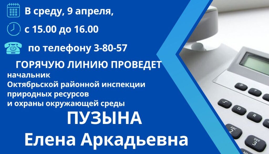 Горячую линию проведет начальник Октябрьской районной инспекции природных ресурсов и охраны окружающей среды Елена Пузына Прямая линия 08 Апр 2025 950