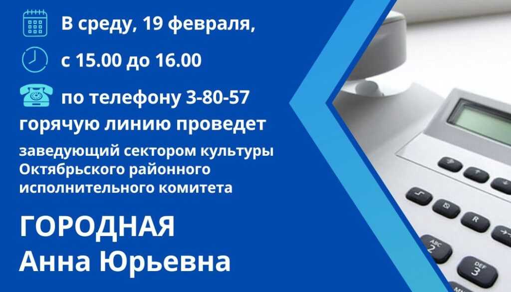 Горячую линию проведет заведующий сектором культуры Октябрьского райисполкома Анна Городная Прямая линия 18 Фев 2025 460