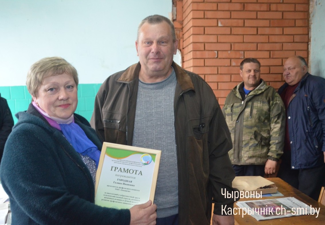 Грамотой Октябрьской районной профсоюзной организации Белорусского профессионального союза работников агропромышленного комплекса и денежной премией в прошедший четверг была отмечена неизменный председатель профкома открытого акционерного общества «Ломовичи» на протяжении последних 16 лет Галина Городная.