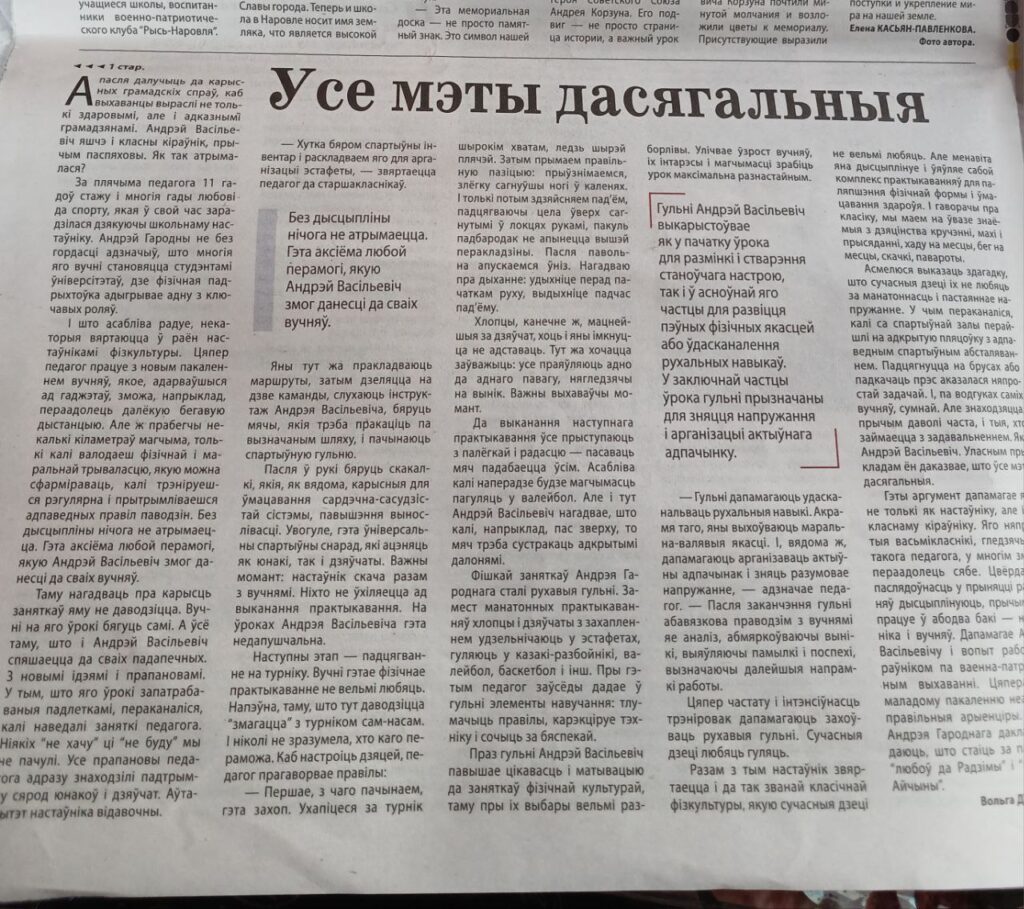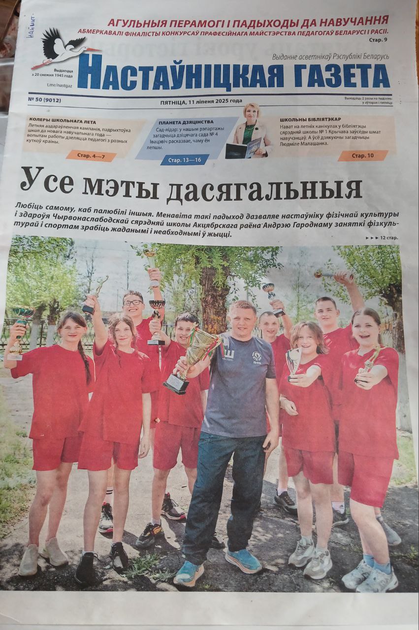 КРАСНОСЛОБОДСКАЯ СШ Октябрьского района в «НАСТАЎНІЦКАЙ ГАЗЕЦЕ» Знай наших! 18 Июл 2025 550 Учитель физической культуры и здоровья ГОРОДНЫЙ Андрей Васильевич со своими учащимися на первой странице «Настаўніцкай газеты». #усемэтыдасягальныя