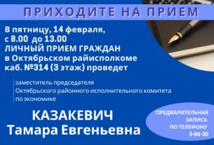 Личный прием граждан проведет председатель Октябрьского районного Совета депутатов Александр Луцкович Прием граждан 03 Дек 2024 650 В среду, 4 декабря, с 8.00 до 13.00 личный прием граждан в Октябрьском райисполкоме каб. №108 (1 этаж) проведет председатель Октябрьского районного Совета депутатов ЛУЦКОВИЧ Александр Григорьевич