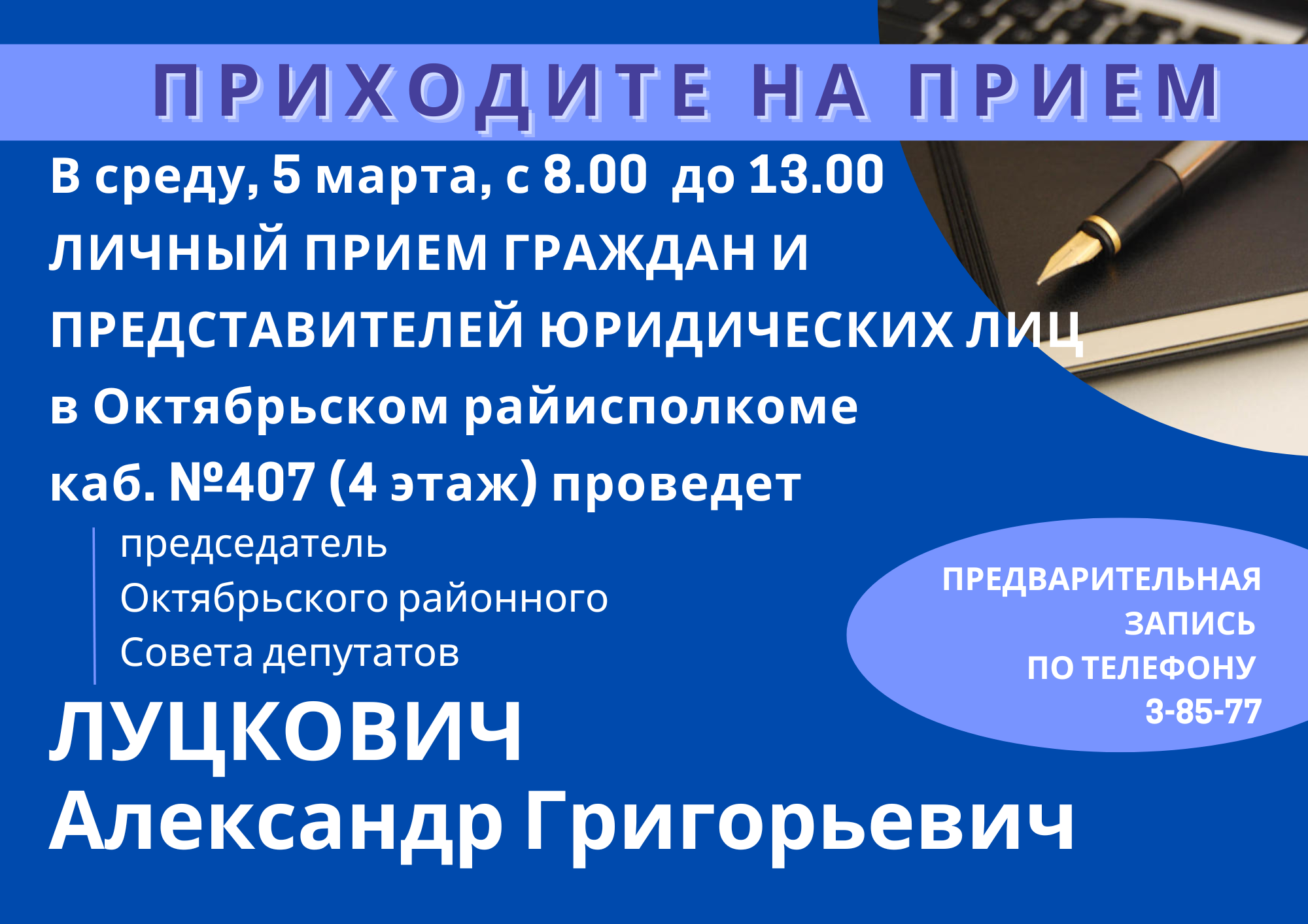 Личный прием граждан проведет председатель Октябрьского районного Совета депутатов Александр Луцкович Прием граждан 27 Фев 2025 680