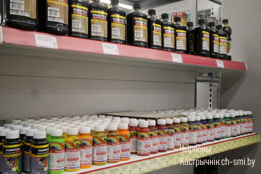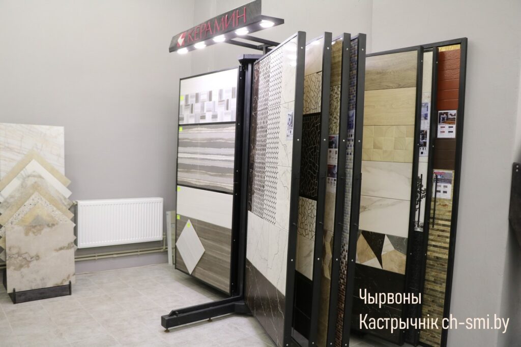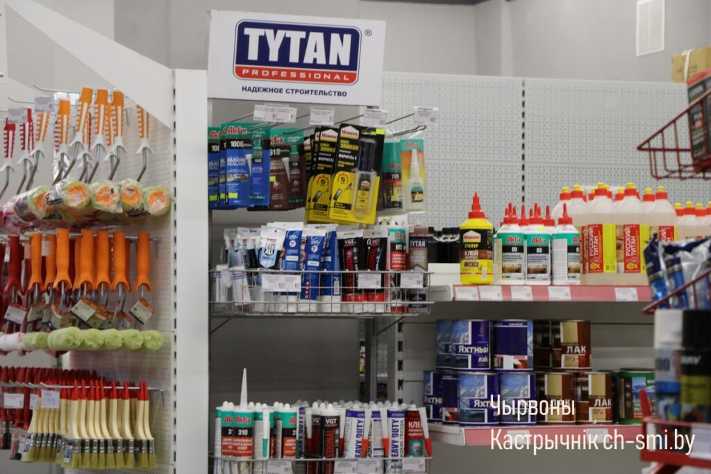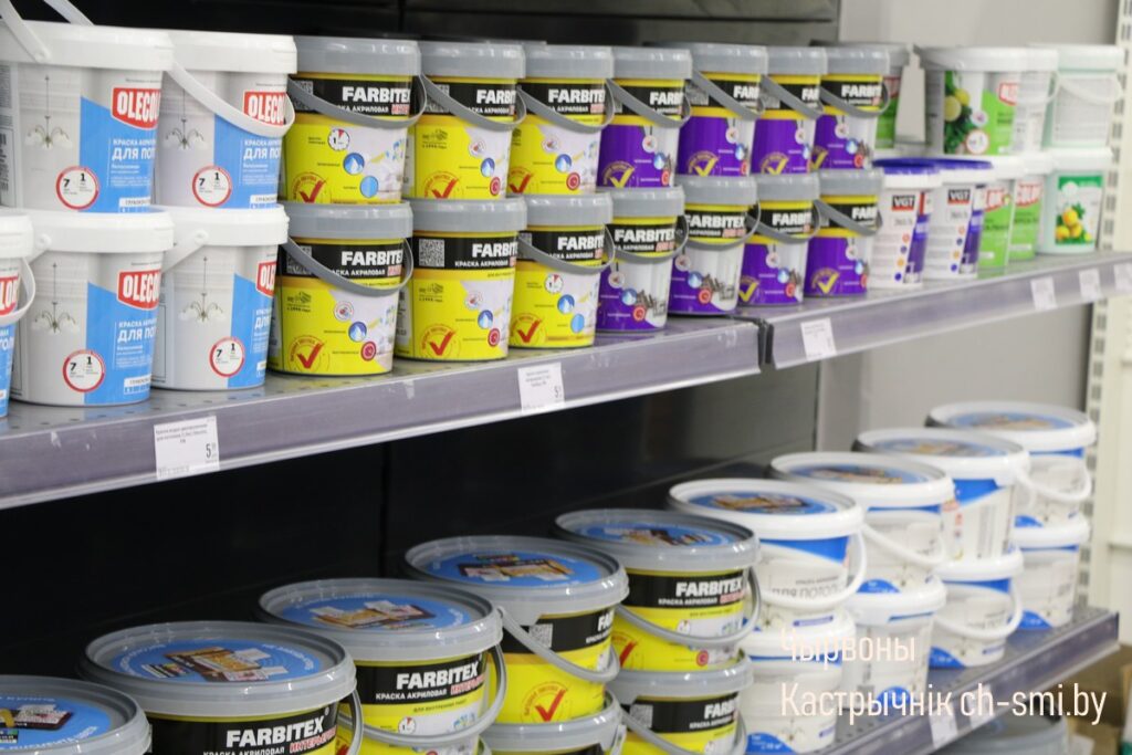 Товары в магазине располагаются на двух этажах. Так, на первом –можно приобрести лакокрасочные материалы, сухие смеси, сантехнику, керамическую плитку, ручной и электроинструмент, на втором – двери, напольные покрытия, обои, электрику,карнизы, рулонные шторы, различный строительный материал.