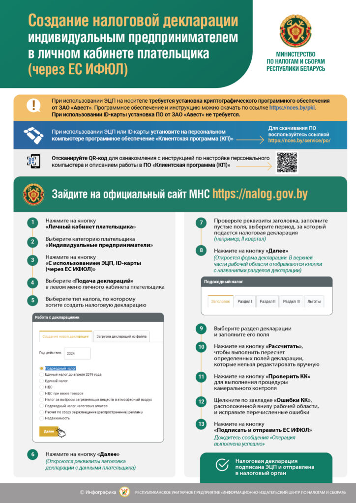 Министерство по налогам и сборам Республики Беларусь напоминает о создании налоговой декларации ИП в личном кабинете плательщика (через ЕС ИФЮЛ) Информация служб 26 Мар 2025 810