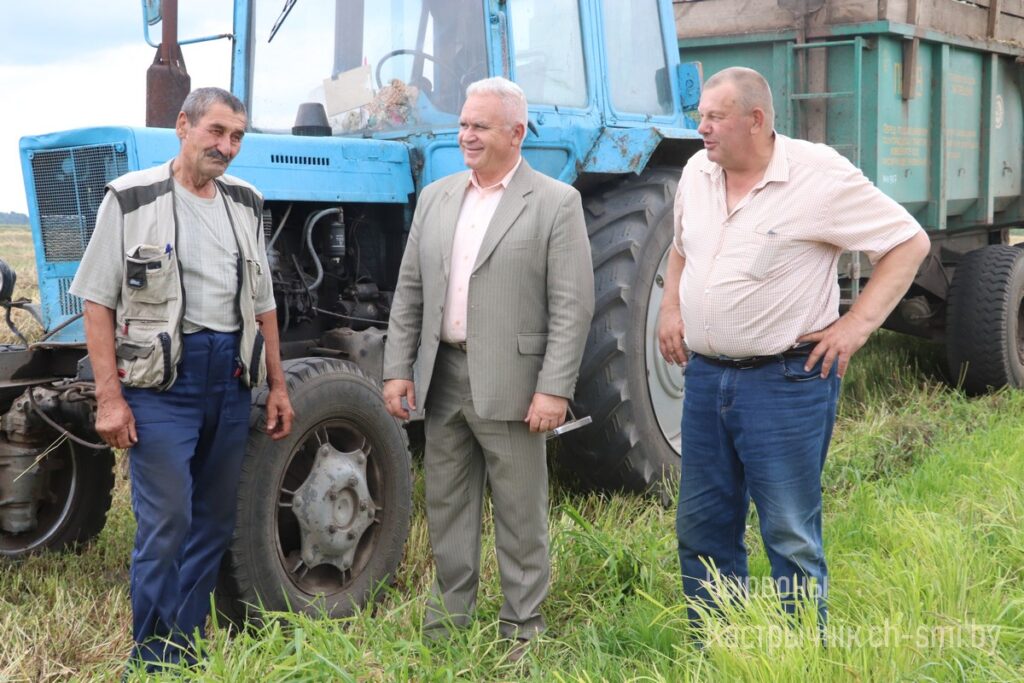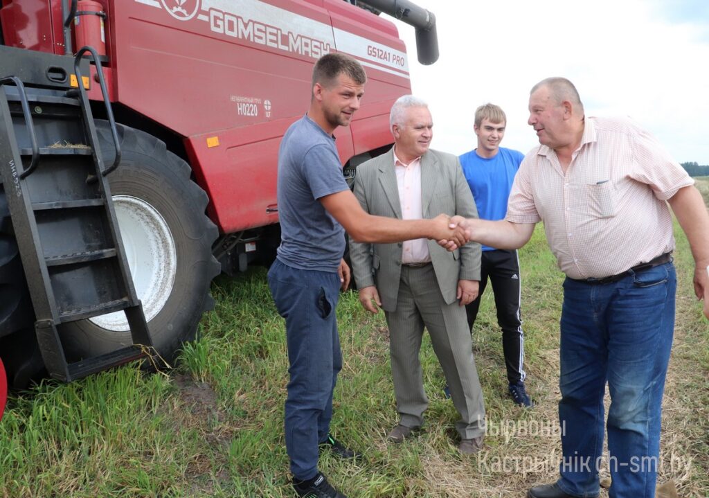 Председатель Октябрьского районного объединения профсоюзов Сергей Заричный и руководитель районной организации профсоюза работников агропромышленного комплекса Николай Рагович во вторник посетили открытые акционерные общества «Бумажкова-агро» и «Дербин», где детально ознакомились с ходом текущей уборки урожая зерновых. В частности, в первом из названных хозяйств тогда было сжато и обмолочено 35% площадей колосовых культур. Их урожайность на данном этапе, к сожалению, невысока – 15 центнеров с гектара, что почти на 4 центнера ниже прошлогоднего. А ведь на жатве 2021 года «бумажковцы» находились в числе лидеров по намолотам, а водитель Сергей Дайнеко вышел первым в районе тысячником на отвозке зерна. Местные хлеборобы, правда, планируют поправить положение, возлагая надежды на участки колосовых в районе Пружинищ и Гороховищ, где, по предварительной оценке, данные культуры уродили лучше.