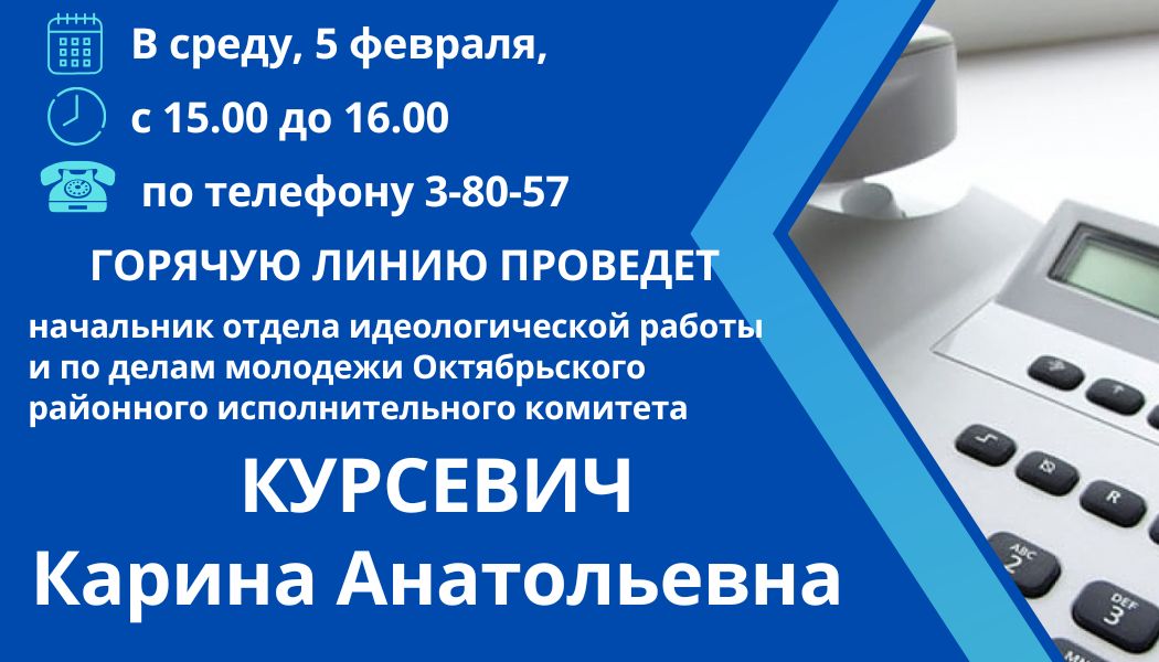 Начальник отдела идеологической работы и по делам молодежи Октябрьского райисполкома Карина Курсевич проведет горячую линию Прямая линия 04 Фев 2025 600