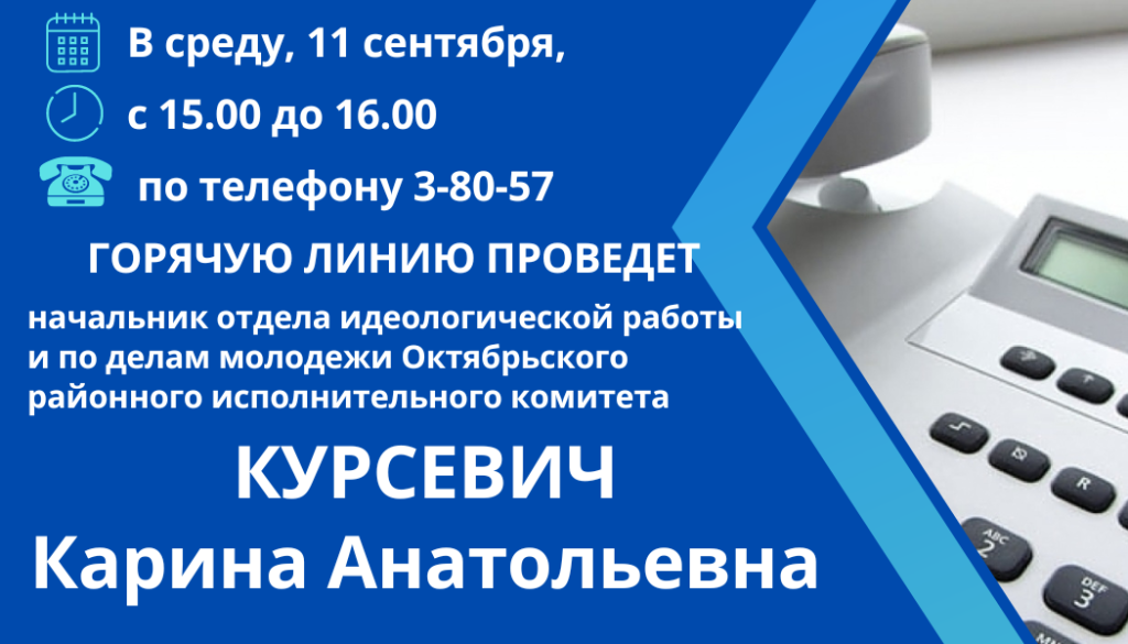 Начальник отдела идеологической работы и по делам молодежи Октябрьского райисполкома Карина Курсевич проведет горячую линию Прямая линия 10 Сен 2024 1580