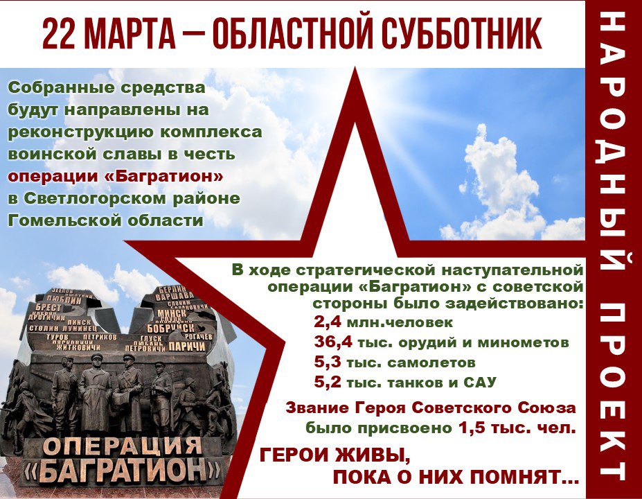 В Год благоустройства работы будут продолжены. Собранные в ходе субботника средства будут направлены на реконструкцию комплекса воинской славы в честь операции «Багратион».