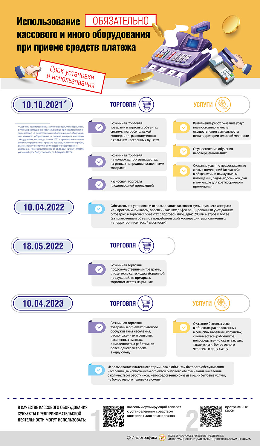 В соответствии с постановлением Совета Министров Республики Беларусь и Национального банка Республики Беларусь от 7 апреля 2021 г. № 203/4 «Об изменении постановления Совета Министров Республики Беларусь и Национального банка Республики Беларусь от 6 июля 2011 г. № 924/16» с 10 октября 2021 г. возникла обязанность применения кассового оборудования при: