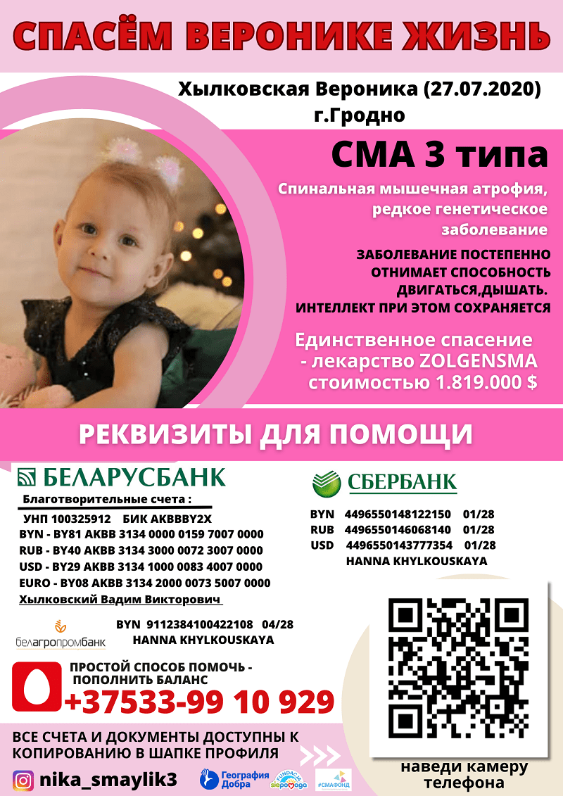 Веронике Хылковской три годика, 23.11.2022 девочке поставили страшный диагноз – спинальная мышечная атрофия (СМА), генетическое заболевание.