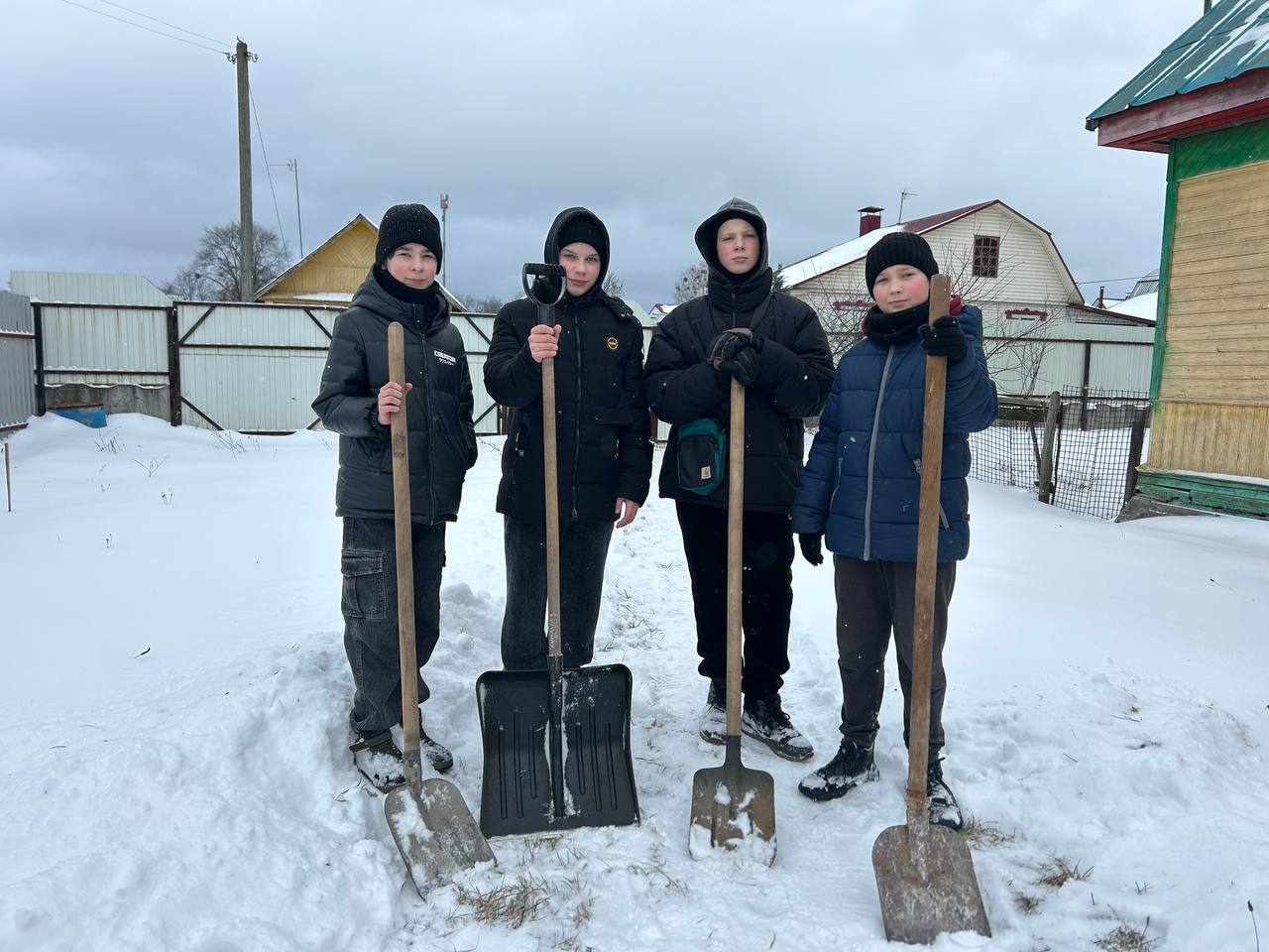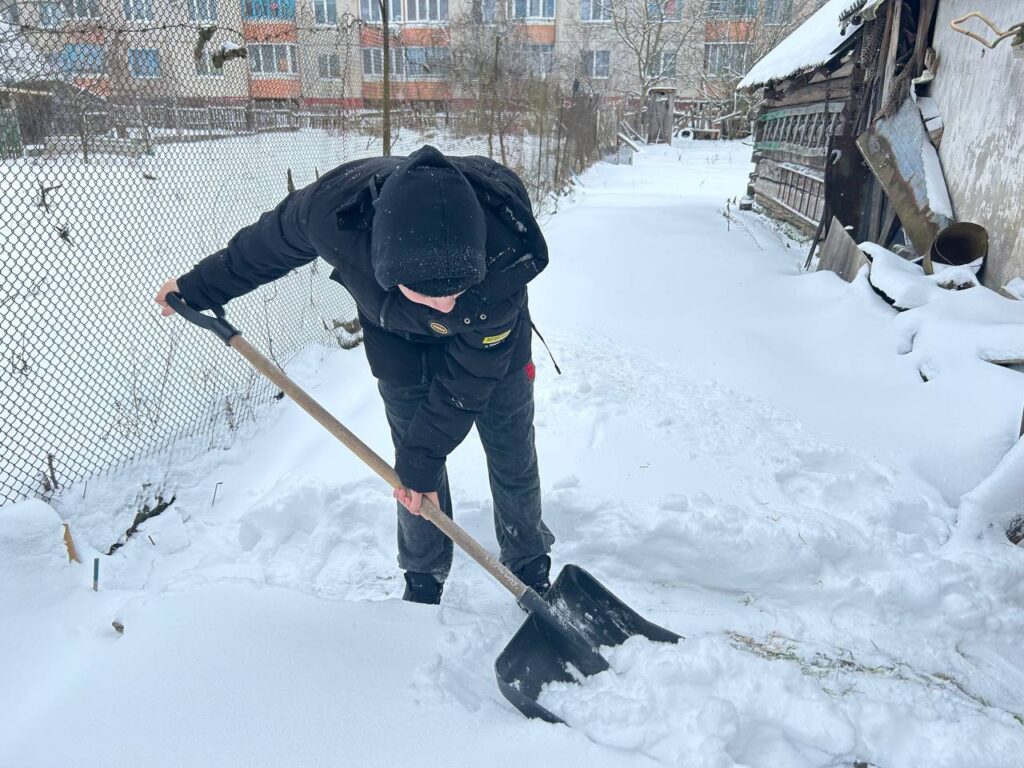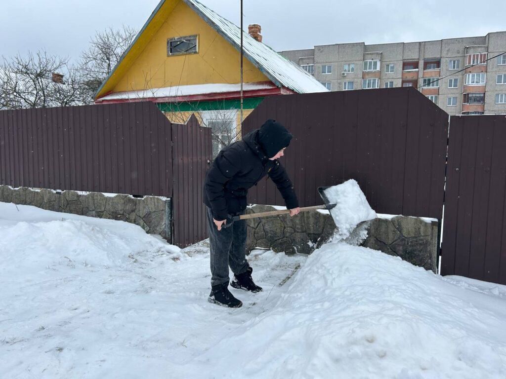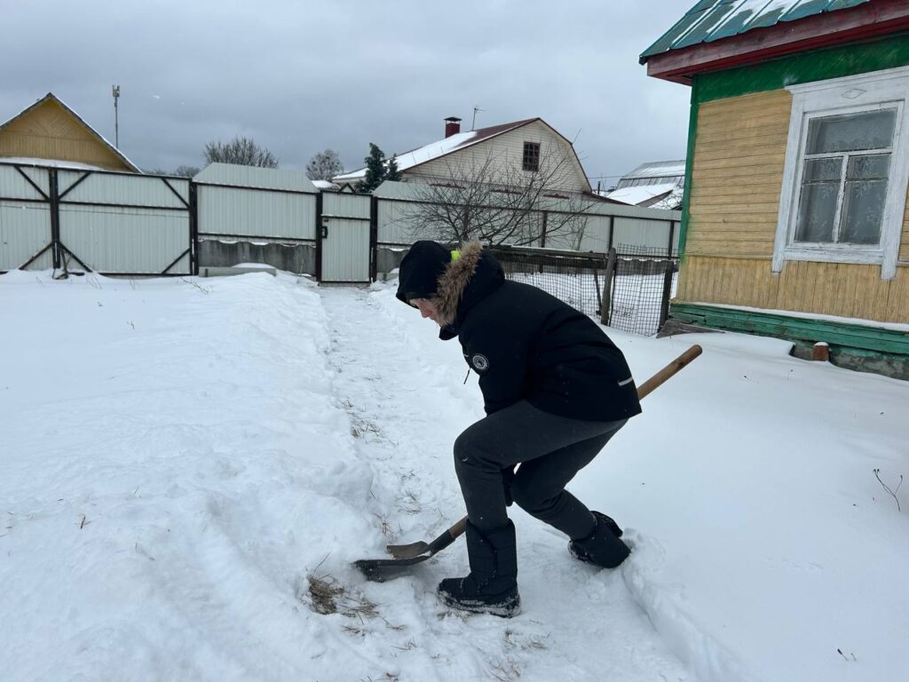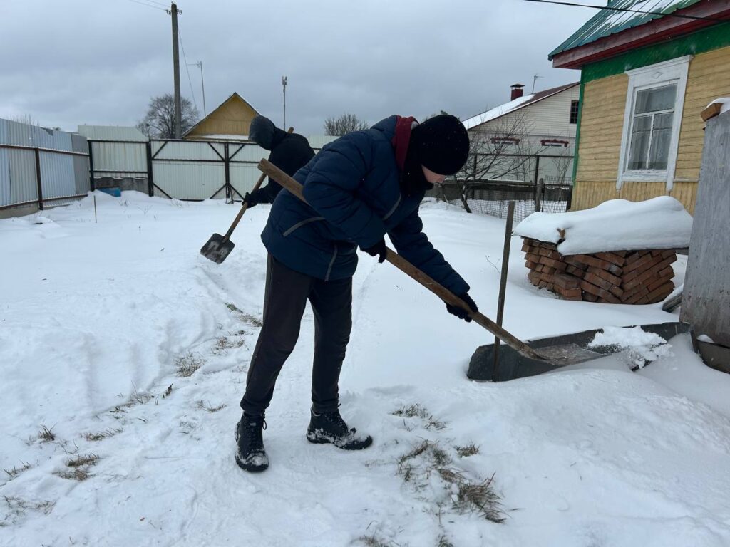 Волонтерская инициатива «Снежный десант». Дружная команда юношей средней школы №2 г. п. Октябрьский, вооружившись необходимым инвентарем, принялась за уборку снега и наледи во дворе дома Драпезы Л. А., узника Озаричского концентрационного лагеря.