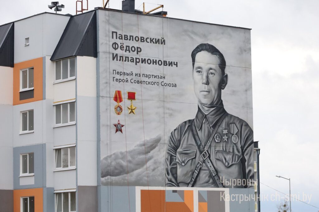 *На фасаде одной из новостроек Октябрьского – многоэтажного жилого дома в поселке Наровлянский появился портрет-мурал Героя Советского Союза Ф. И. Павловского.