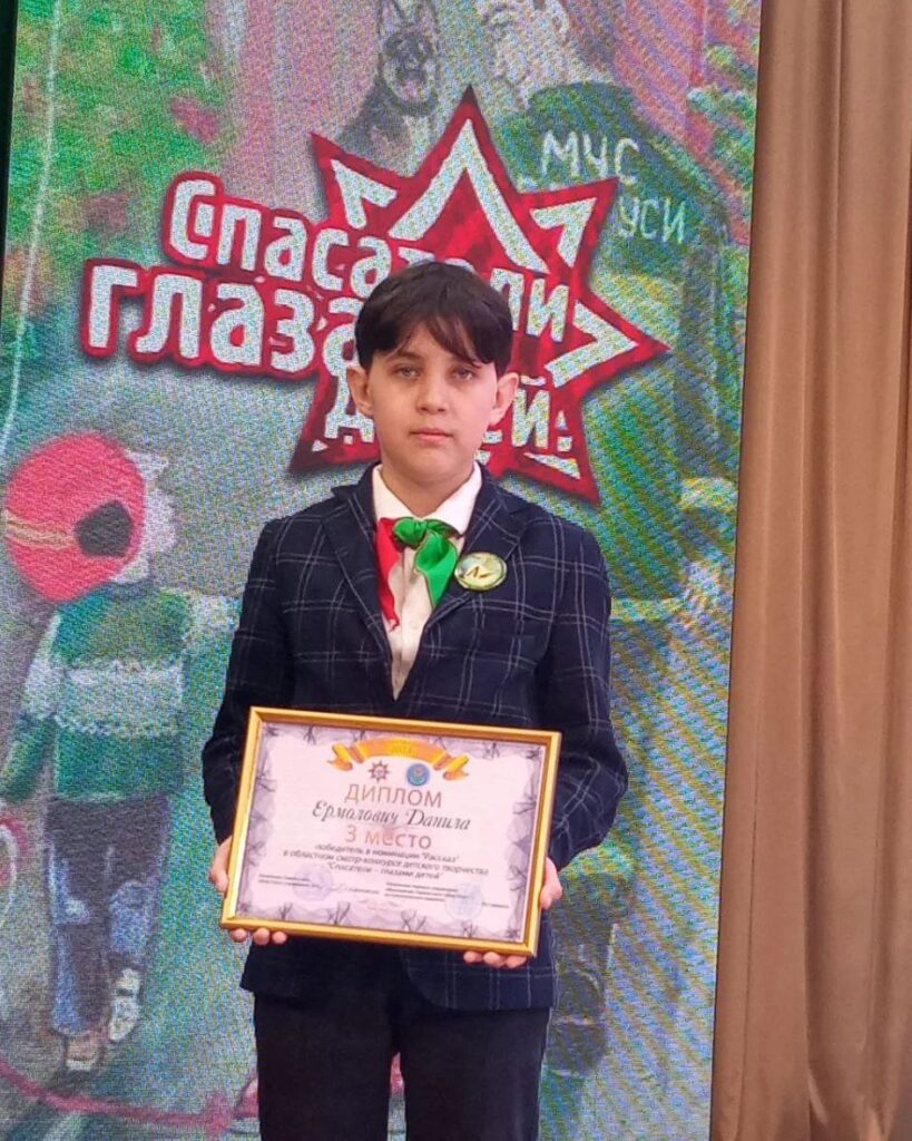 *Дипломом 3 степени областного смотр-конкурса детского творчества «Спасатели – глазами детей» награжден Ермолович Данила, учащийся 7 класса ГУО «Средняя школа №1 г. п. Октябрьский имени А. Р. Соловья». Данила стал победителем в номинации «Рассказ».