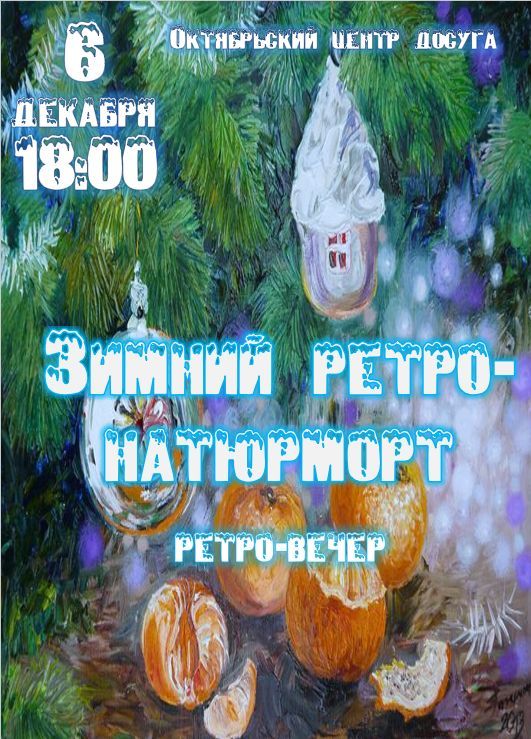Октябрьский центр досуга приглашает на ретро-вечер «Зимний натюрморт» Реклама, объявления 04 Дек 2025 1800 Дата: 06.12.2025 г.Время: 18:00.Место проведения: филиал «Октябрьский центр досуга» Не упустите возможность провести вечер в компании друзей под сказочную музыку и уютную атмосферу!