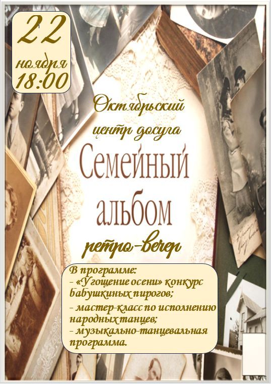 Октябрьский центр досуга приглашает всех желающих на ретро — вечер «Семейный альбом» Реклама, объявления 19 Ноя 2025 1740 Октябрьский центр досуга приглашает всех желающих 22 ноября в 18.00 на ретро — вечер «Семейный альбом»